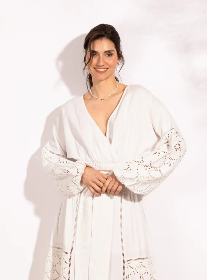 Falda corta cruzada bordada. Podés ceñirla a la cintura con su lazo para un look ajustado. Confeccionada con lino 100 % algodón, lo que la hace fresca y distinguida.