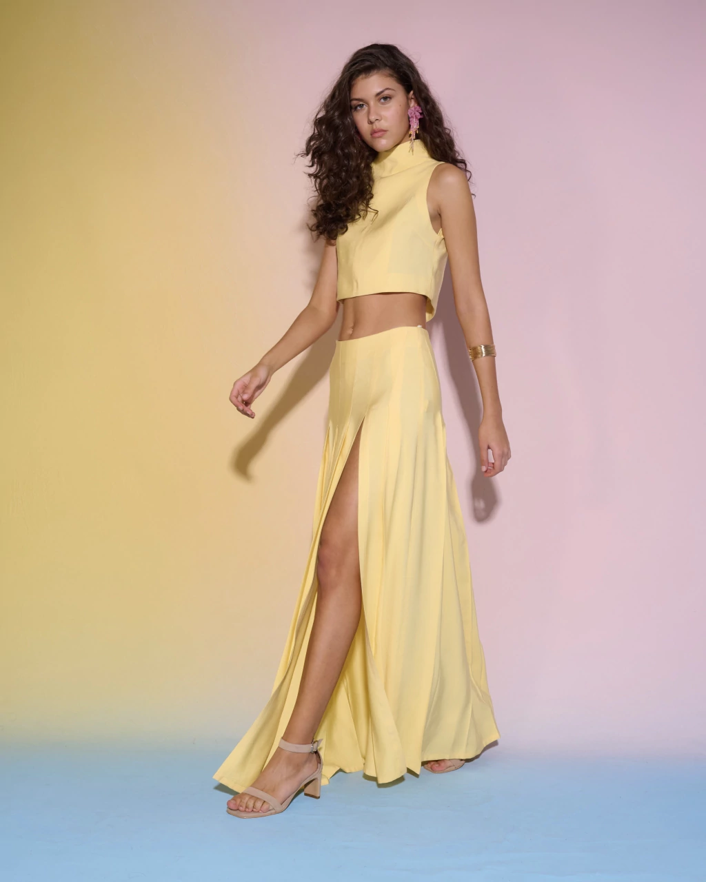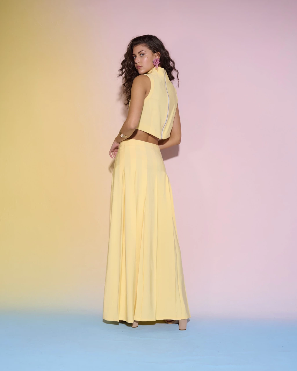 Falda larga sastrera en creppe twill con tablas. Tiene tajo y cierre en lateral.