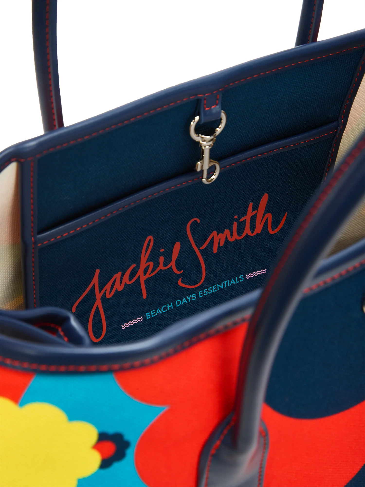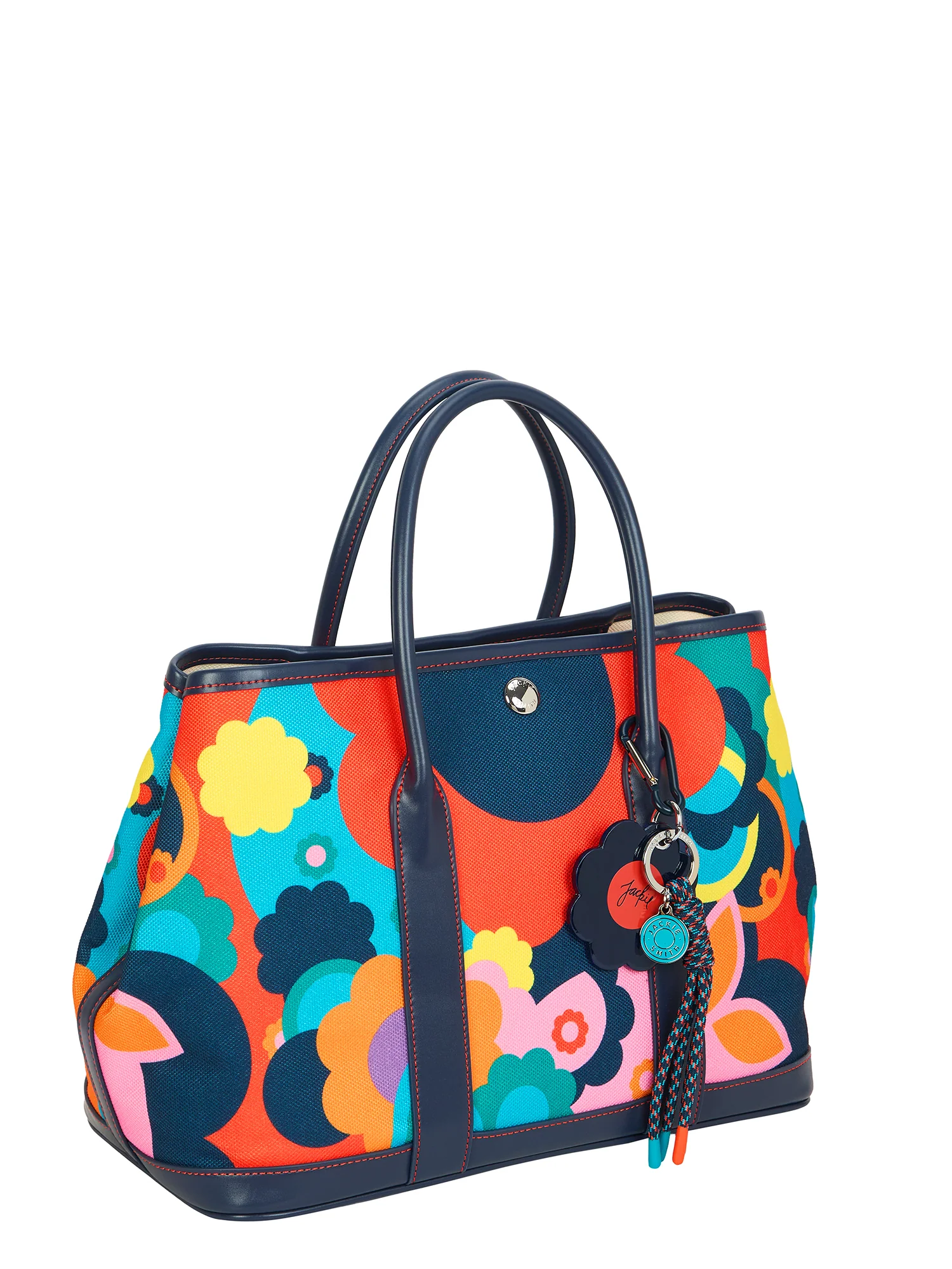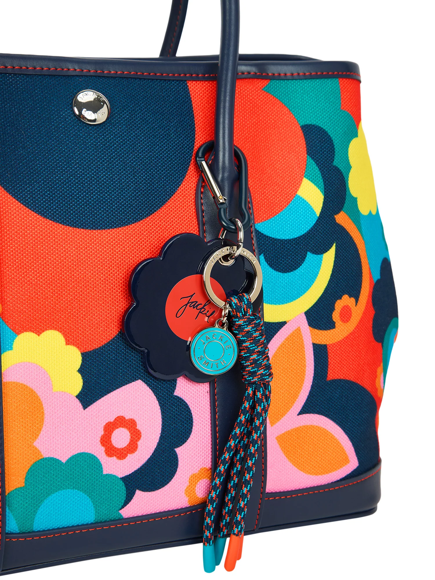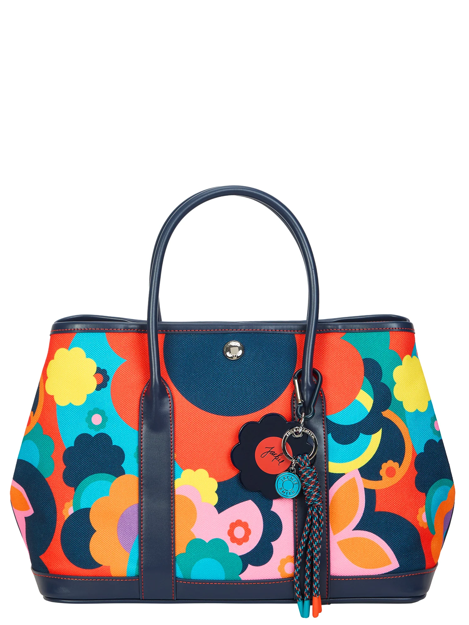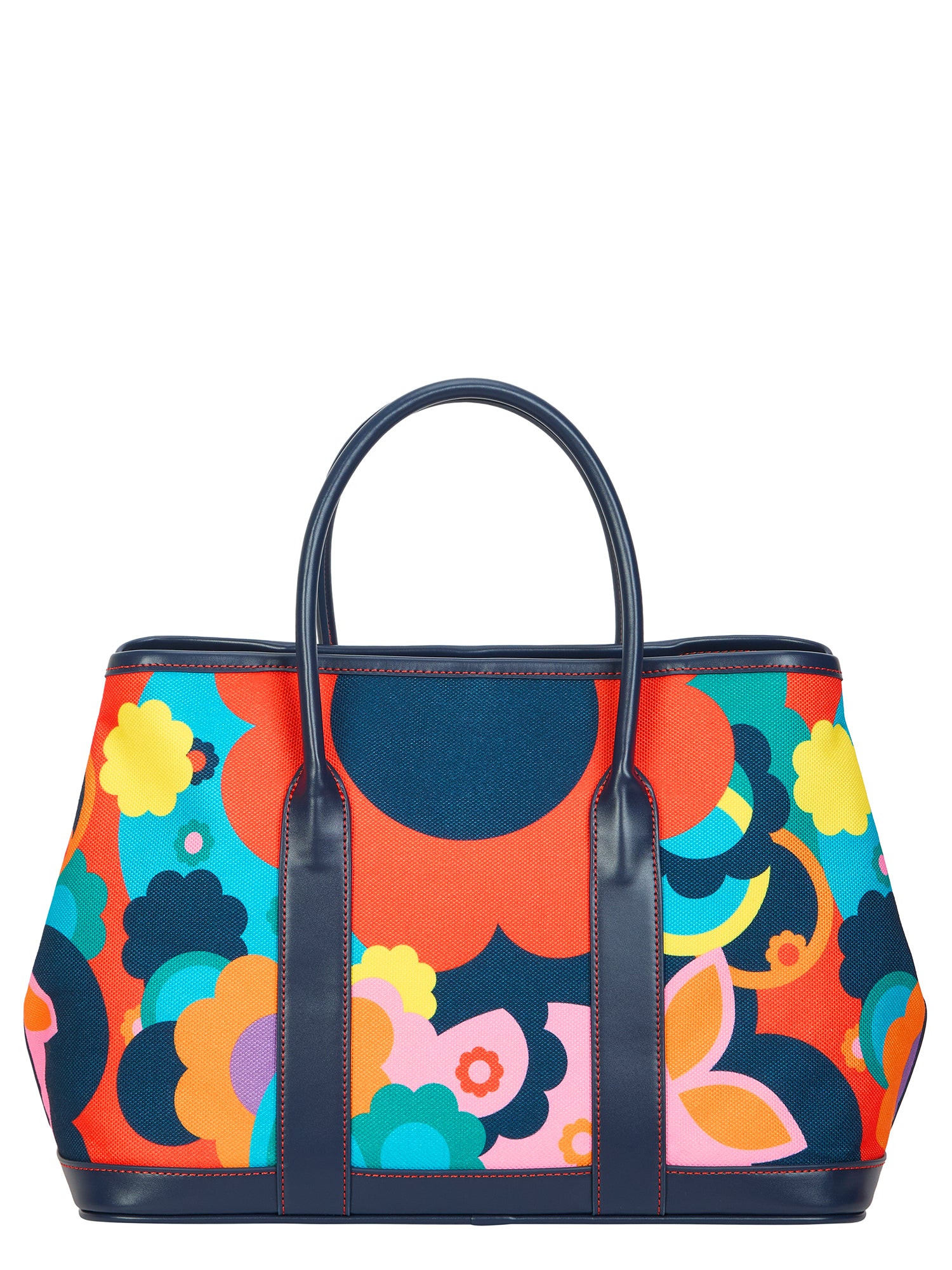 Grace evoca los días pausados, el murmullo del mar y la promesa suspendida de las tardes sin prisa. Confeccionada en canvas de algodón, su composición de flores abstractas y contrastes vibrantes traduce la energía estival en un gesto gráfico y sofisticado. Acentos en PU vaqueta contribuyen a acentuar el espíritu resort que la envuelve: color, frescura y un toque de sofisticación relajada. Sus herrajes bañados en níquel aportan estructura y brillo sutil, mientras el interior en canvas revela una organización práctica y precisa. El llavero removible, con charm en forma de flor y detalles esmaltados, actúa como un guiño alegre —una pequeña celebración del verano, de su luz, y de esa sensación de belleza que parece durar para siempre.