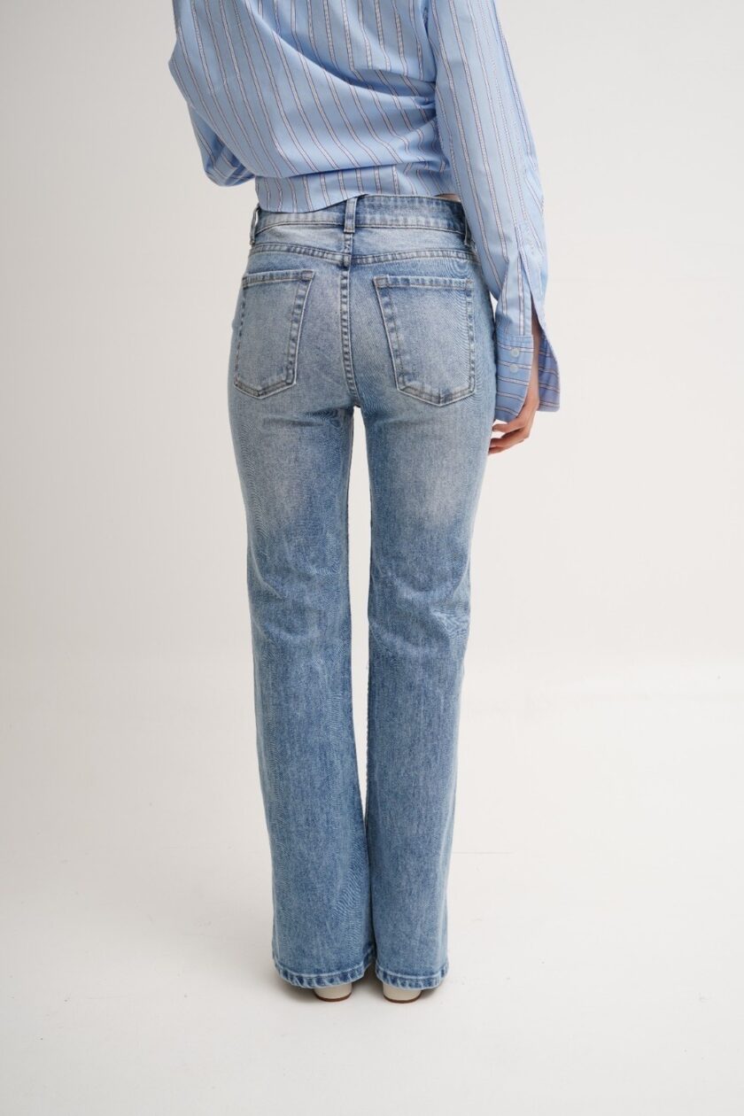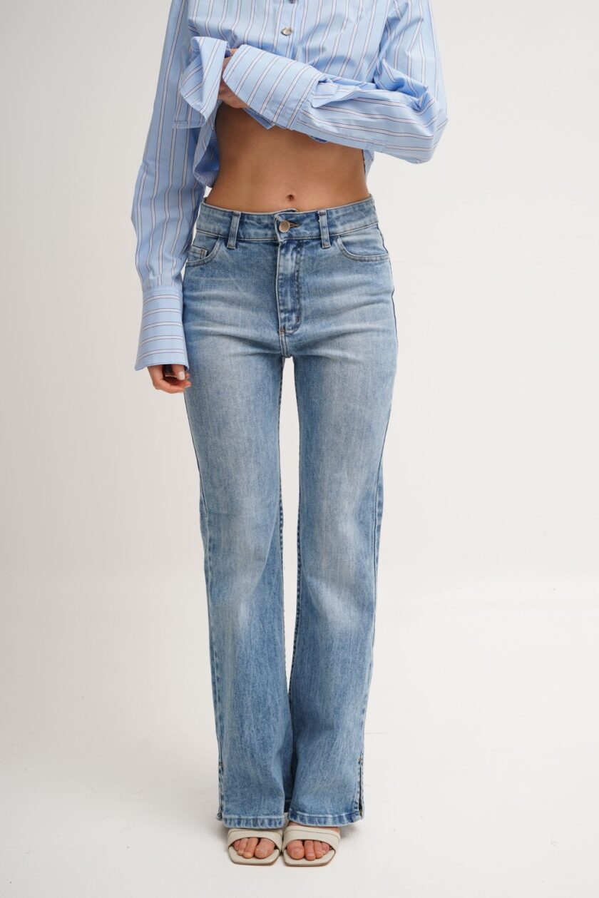 Jean de fit flare, tiro medio, con tajos laterales. Confeccionado en denim con elastano, con lavado celeste claro, bigotes y desgastado localizado, con ruedo desgastado y desflecado, para un look relajado y urbano. Abril usa talle 26