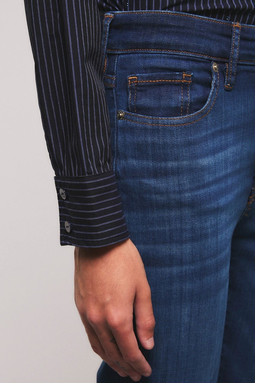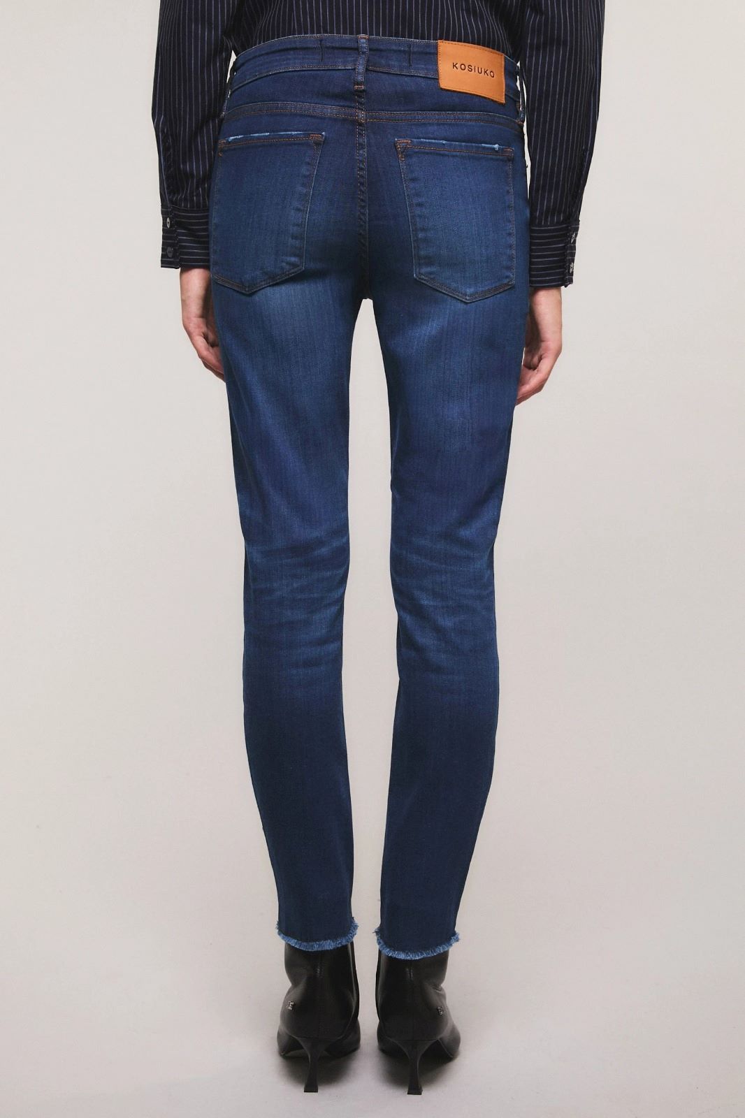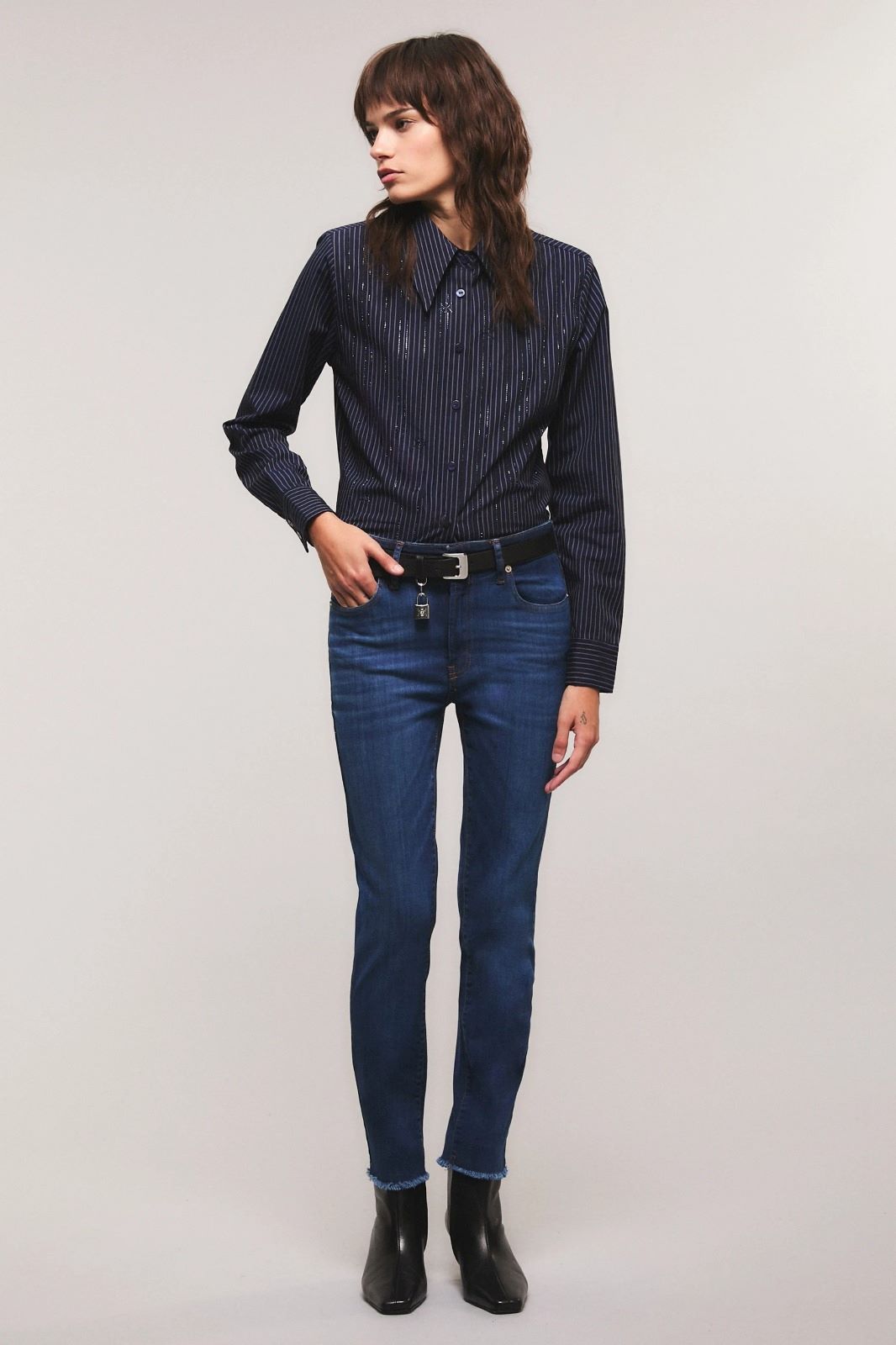 El Jean Cigarette Pure Blue presenta un calce slim y tiro medio, confeccionado en tejido de alta performance que garantiza comodidad y durabilidad. Su lavado artesanal crea un tono mid blue único, realzado con bigotes y marcas localizadas en zonas de mayor desgaste de la prenda. Miranda está usando en la prenda superior un talle S, y en la prenda inferior un talle S/26. Sus medidas son: Altura 1. 73 m. Busto 77 cm. Cintura 59cm. Cadera 85cm.