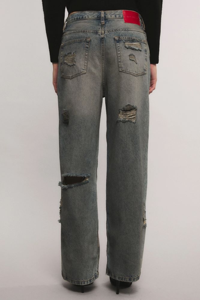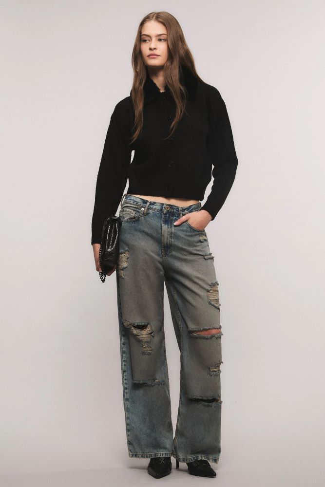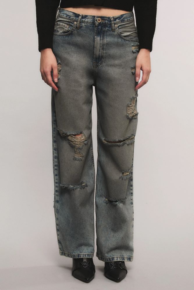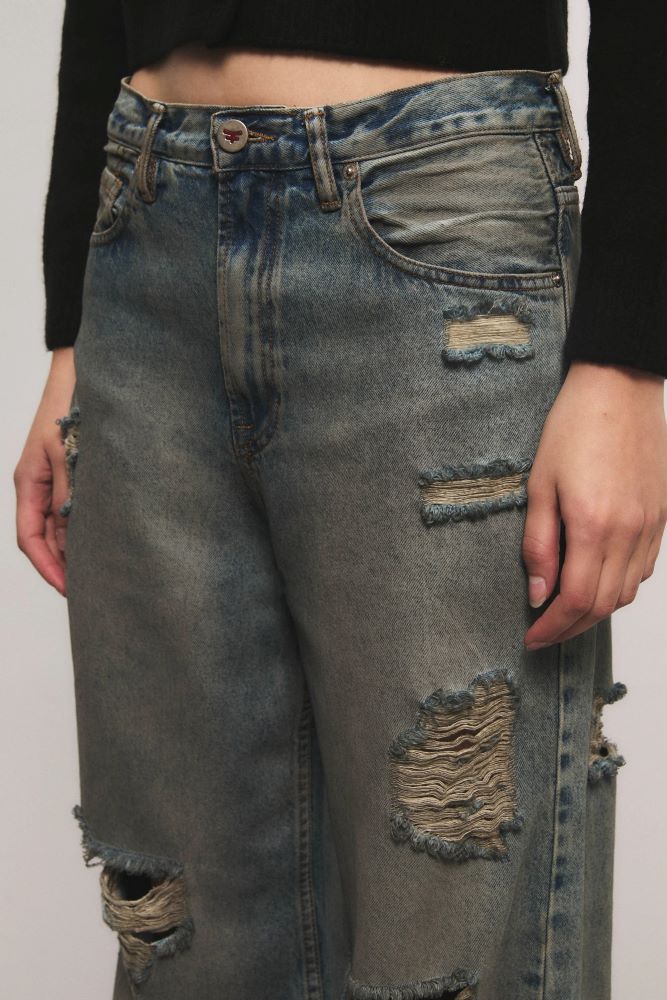 El Jeans Irony Rock It inspirado en la silueta de los años 00` es de calce loose, tiro medio y piernas sutilmente voluminosas. Confeccionado en un tejido 100% algodón. Su proceso de lavado presenta tratamientos artesanales aplicando un efecto pulverizado que genera matices en tonos grises, con roturas y desgastes localizados. Eva está usando en la prenda superior un talle S, y en la prenda inferior un talle S, 26. Sus medidas son: Altura 1.78 m. Busto 78 cm. Cintura 57 cm. Cadera 86 cm.