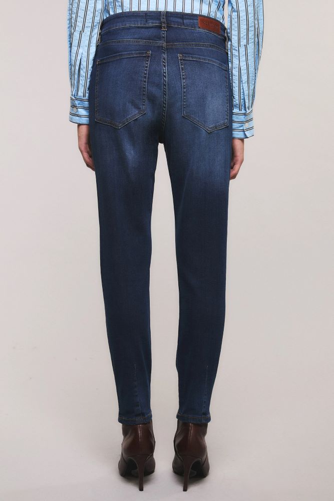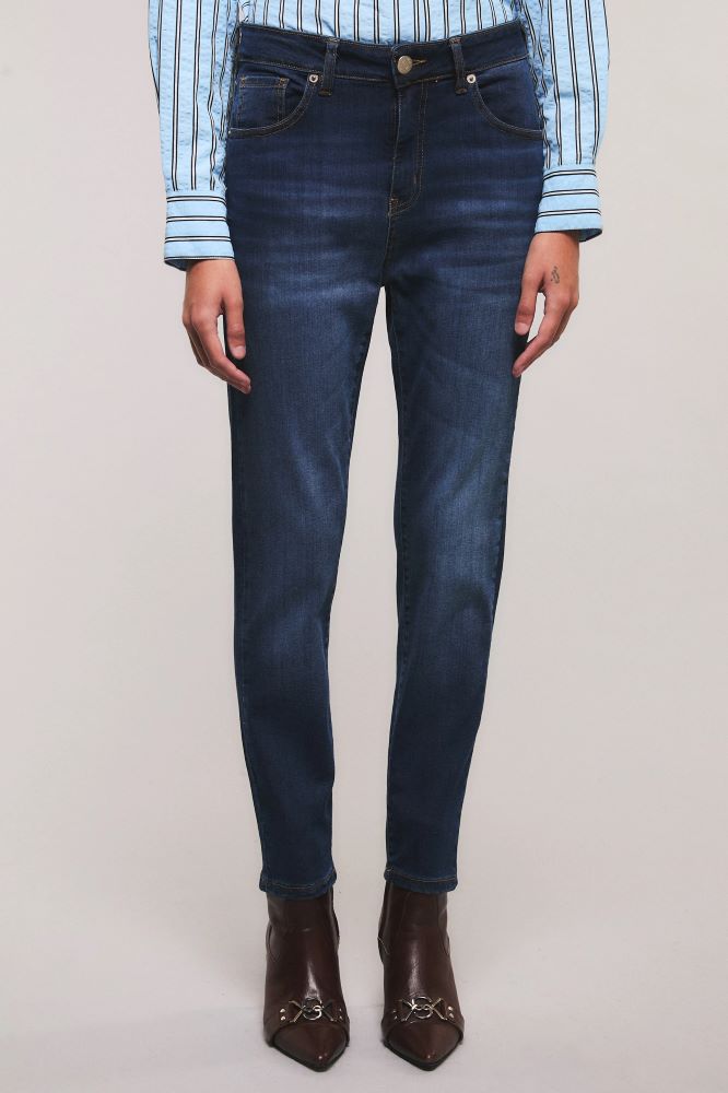 El Jeans Moon Deep Blue tiene calce slim y tiro medio. Presenta una silueta ajustada que se ajusta desde la cintura hasta mitad de muslo. Esta confeccionado en tejido de alta performance. Su proceso de lavado artesanal le confiere un tono mid blue. Miranda está usando en la prenda superior un talle S, y en la prenda inferior un talle S/26. Sus medidas son: Altura 1. 73 m. Busto 77 cm. Cintura 59cm. Cadera 85cm.