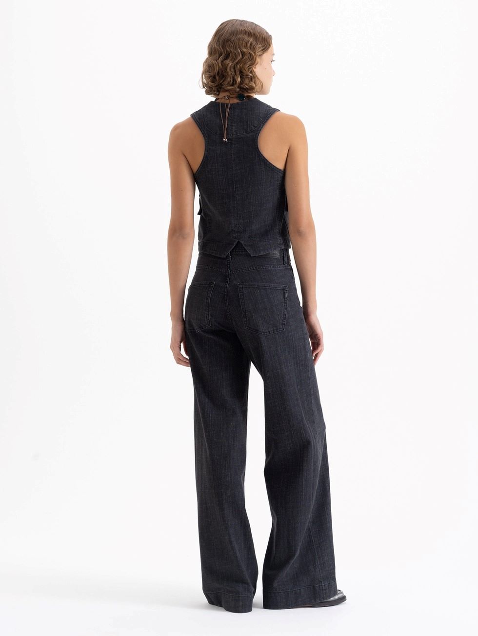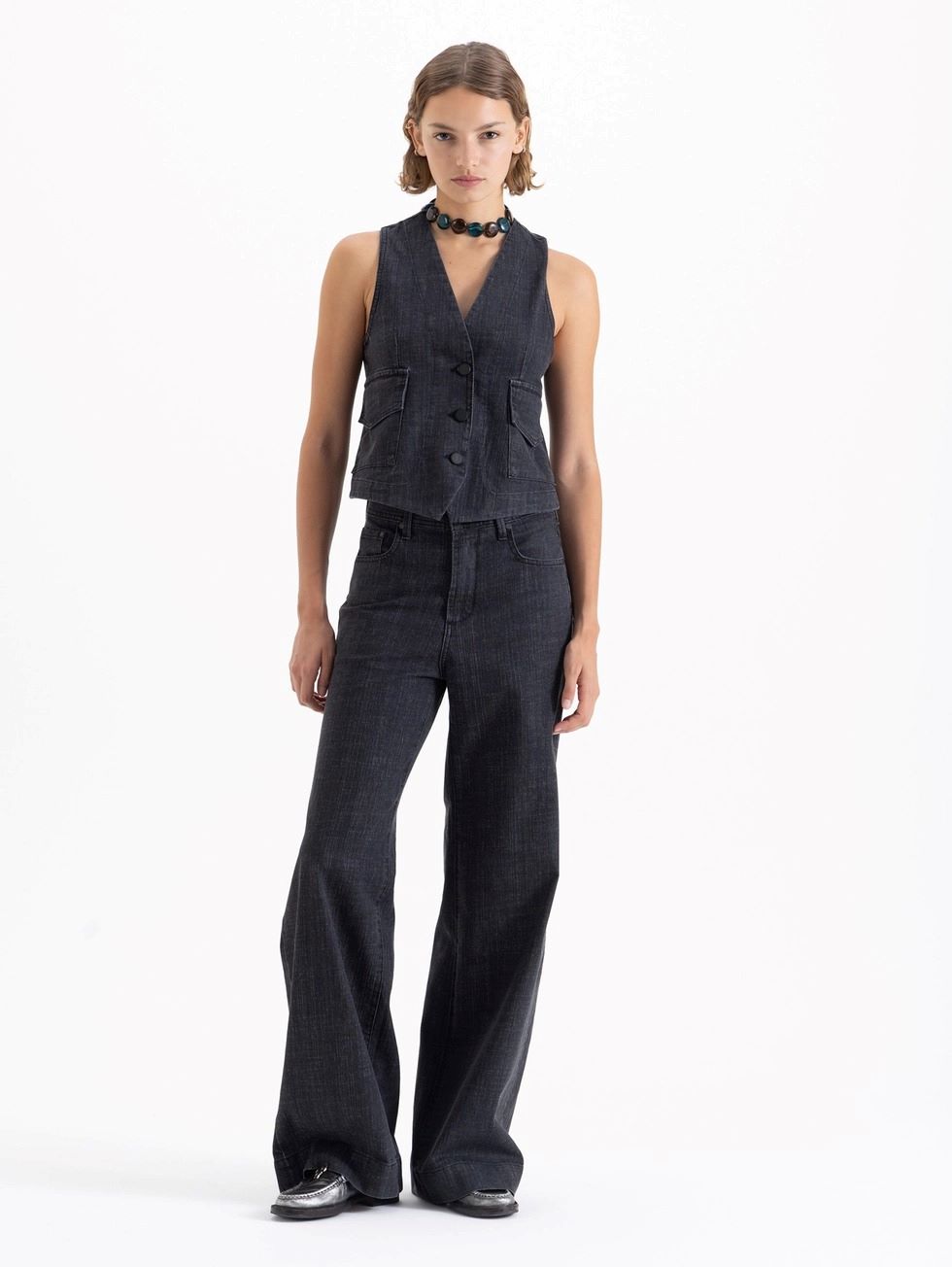 Jeans Wide Icon Black wide leg confeccionado en denim tipo sastrero color negro, liviano y con leve elasticidad para mayor confort. De tiro medio y caída amplia.