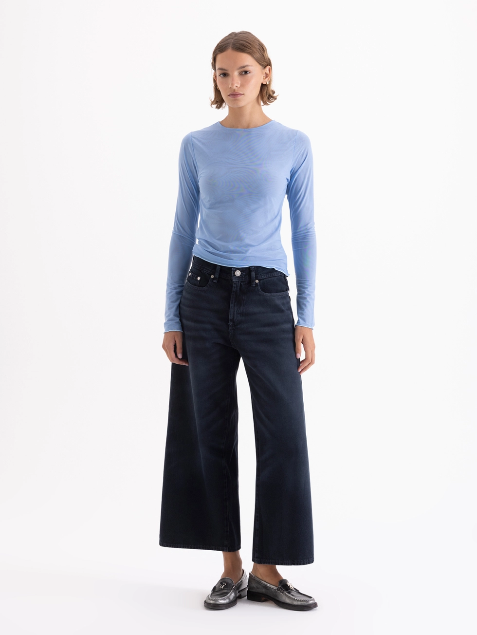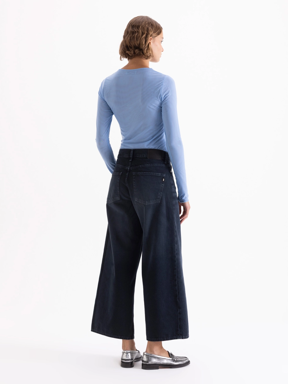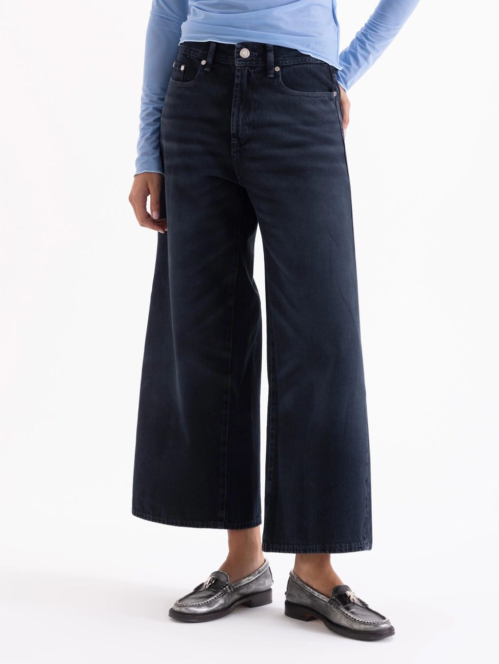 Jeas Wide X Blue Wide cropped confeccionado en tejido blue black que significa que es color índigo y negro dando un tono especial y diferente. Es 100% algodón, rígido. El calce es relajado, sugerimos para que quede oversize comprar un talle más grande.