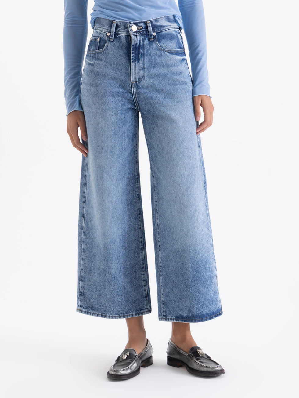 Jeans Wide X Blue de calce wide leg cropped. Confeccionados en denim 100% algodón con un lavado azul clásico y desgastes que aportan un look atemporal. De fit relajado, pero al elegir un talle más chico pueden usarse más altos y ajustados en la cadera.