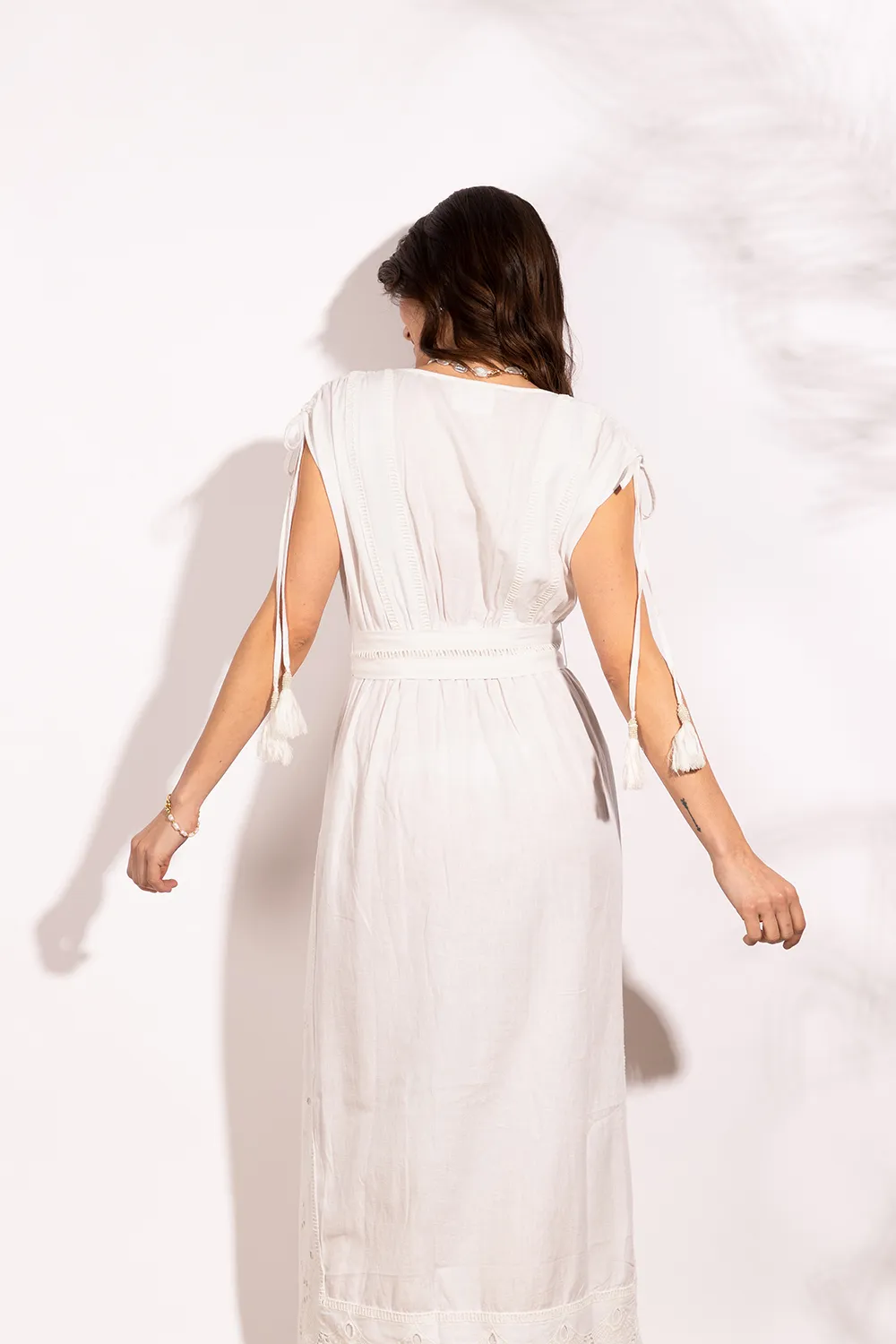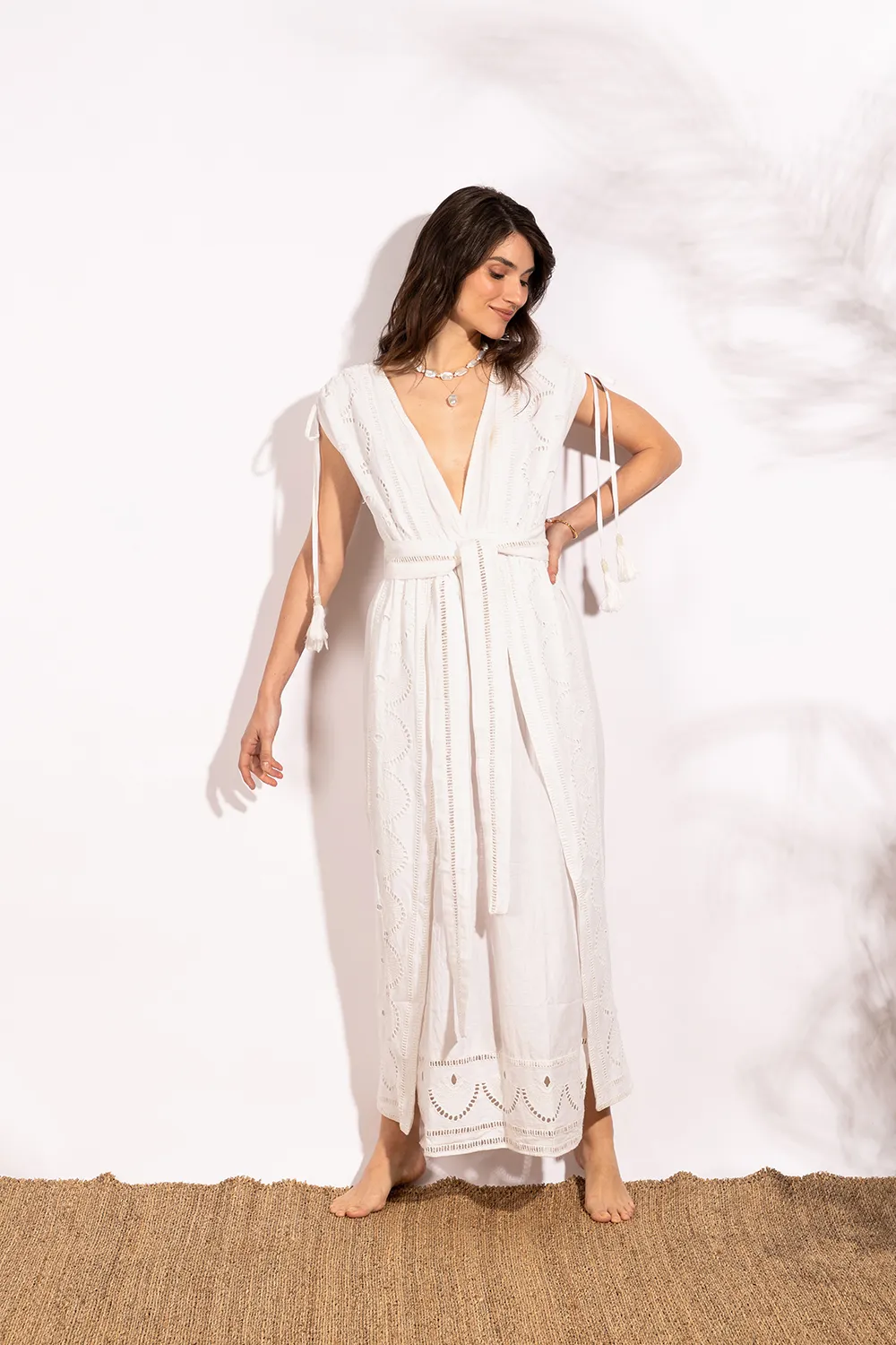 Kaftán largo bordado sin mangas. Se ajusta a la cintura por medio de un elástico y un festón que crea un gran lazo en la parte delantera. La falda tiene dos aberturas delanteras que dejan ver las piernas al caminar. Confeccionado con lino 100 % algodón., lo que le da un toque fresco y elegante.