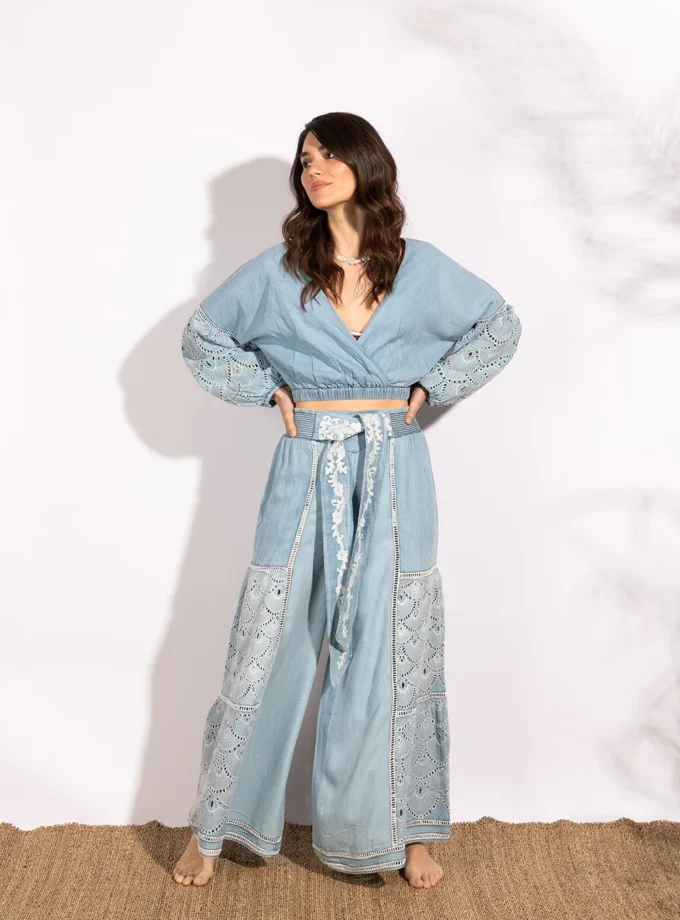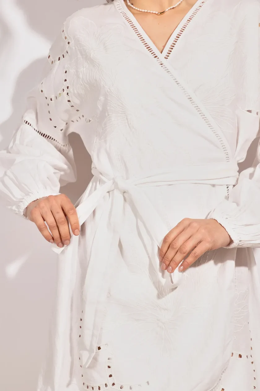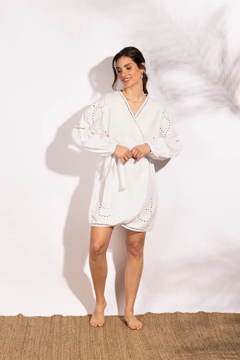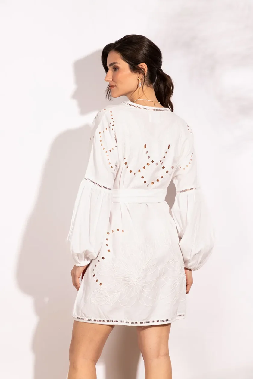Vestido corto con un diseño único de bordado y calados. Tiene mangas largas abullonadas. Podés envolverlo con el cinturón para un look ajustado. Confeccionado con lino 100 % algodón, lo que le da un toque fresco y distinguido.
