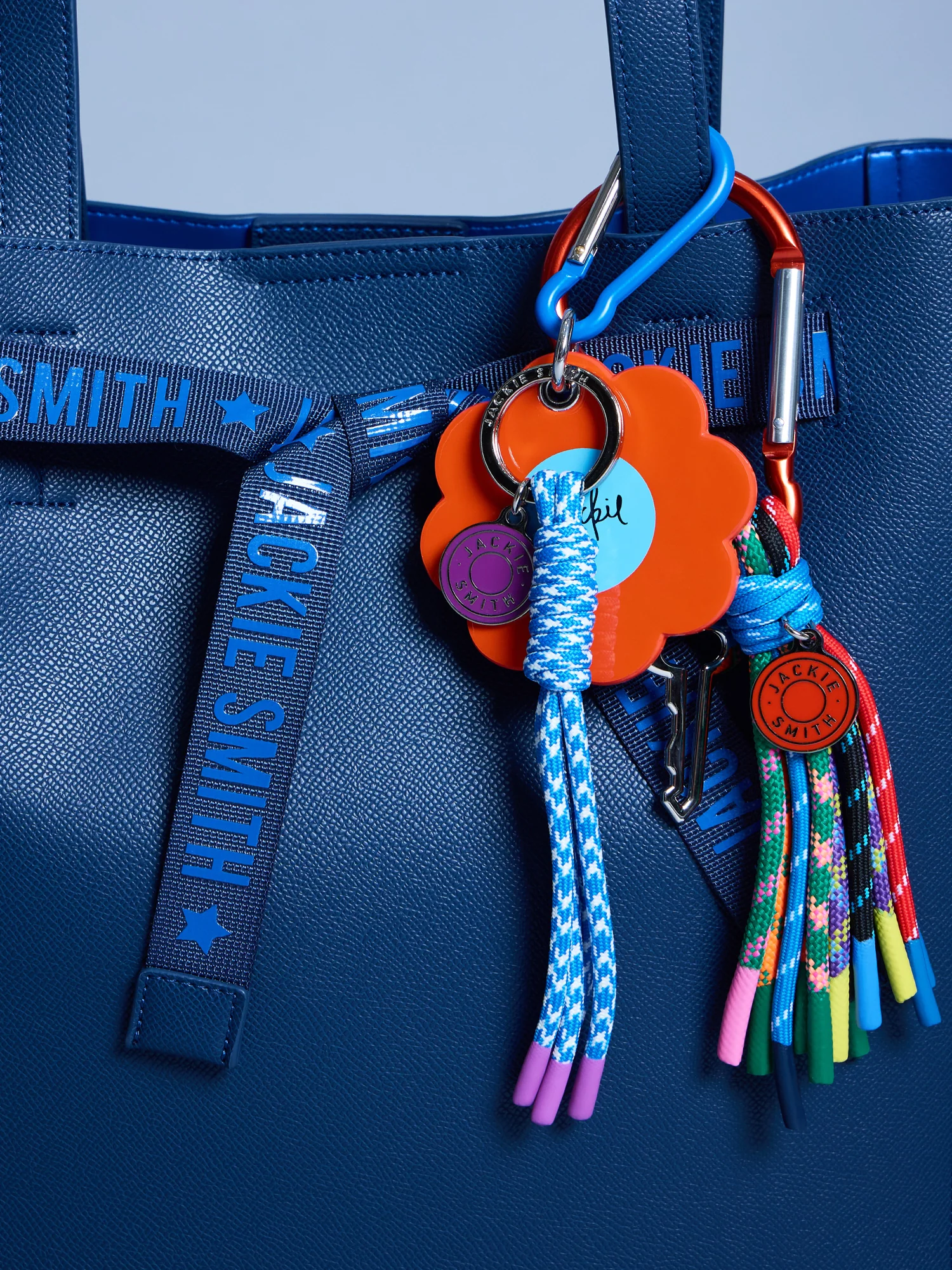 El mosquetón metálico aporta un contrapunto pulido y funcional, mientras el herraje esmaltado Jackie Smith actúa como firma discreta, casi como un pequeño recordatorio de llevar las cosas con menos solemnidad y más intención. En el universo Jackie, este charm funciona como un talismán contemporáneo: fácil de enganchar, difícil de ignorar. Un acento alegre y urbano que acompaña llaves, carteras o mochilas, sumando carácter, ritmo y una dosis justa de optimismo.
