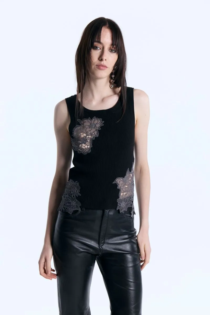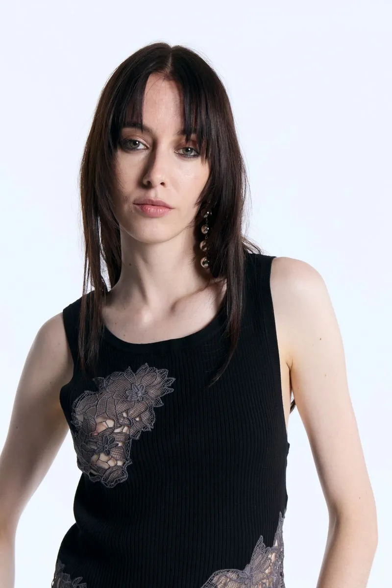 La musculosa Lamu de rib calce ajustada al cuerpo, escote a la base. Cuenta con detalles de recortes de encaje a contra tono en cuerpo para un look romántico y etéreo, super canchero para una cita o salida con amigas. Ideal para combinar con la bermuda Lamu.