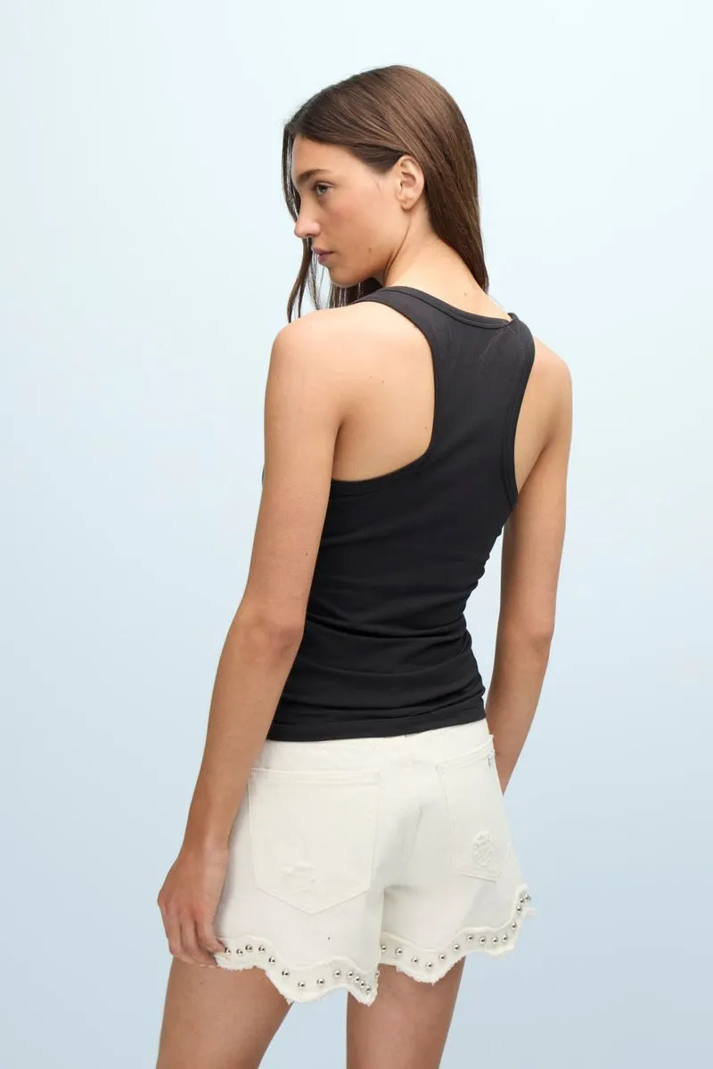La Musculosa Montego, de pima de algodón peruano con lycra, es de calce fitted, con escote en “U” y espalda deportiva. Cuenta con detalle de acceso de cartera de botones a tono personalizados. Presenta detalle de bordado marcario a tono en frente como distintivo. Perfecto para combinar con cualquier look tanto de día como de noche.