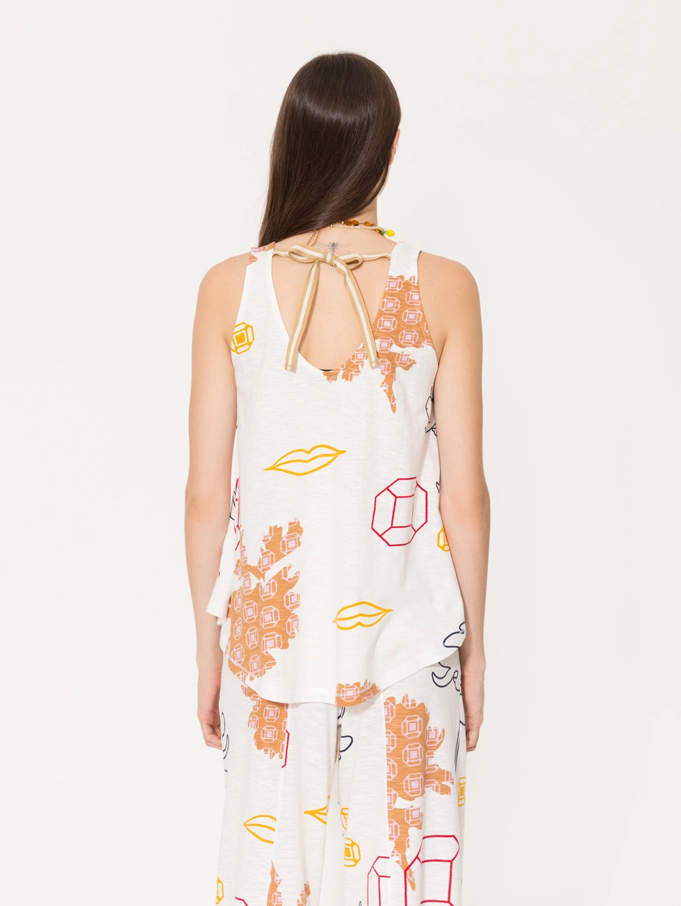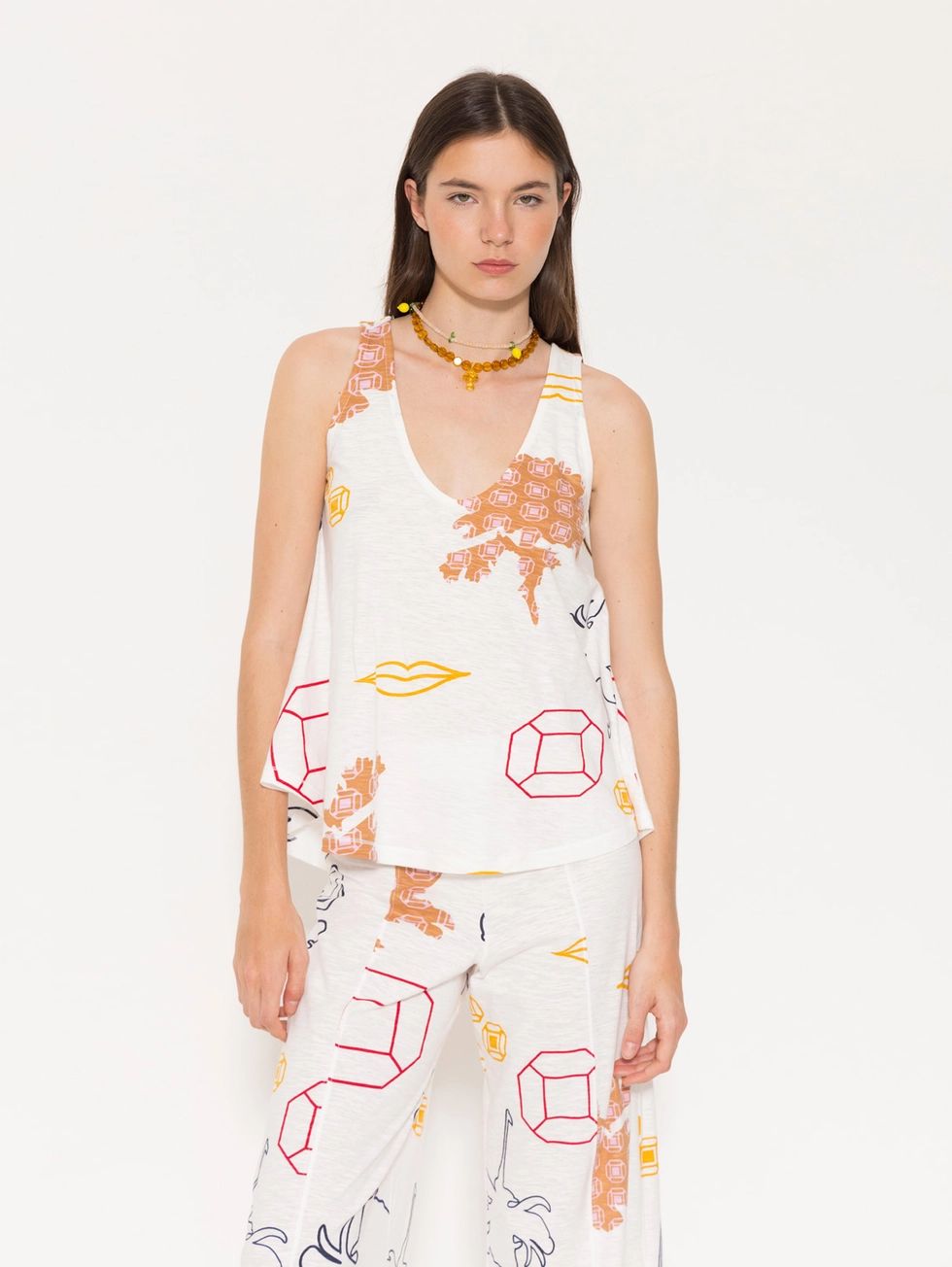 Musculosa Paris confeccionada en flamé estampado, de silueta amplia y cómoda. Su escote es en V amplio.