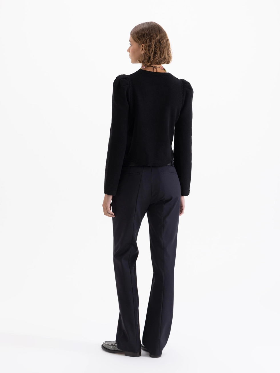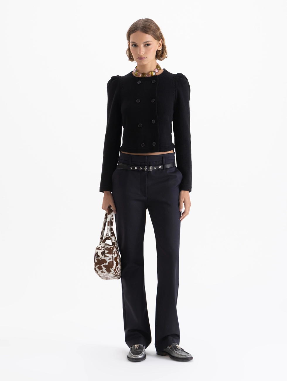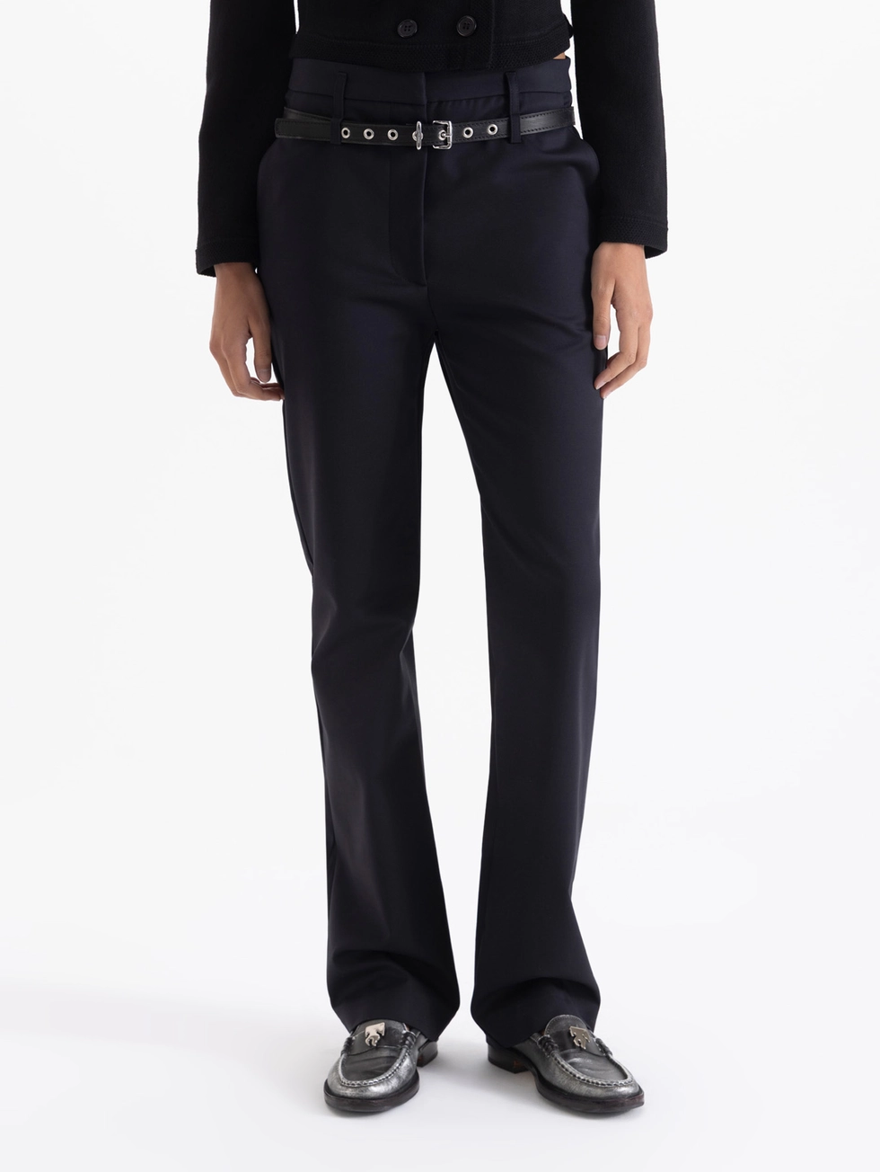 Pantalón Amy inspirado en el clásico sastrero, con raya marcada al centro y pierna recta. Se moderniza con un cinto desmontable de cuero vacuno con herrajes metálicos níquel. Lleva bolsillos delanteros biselados, bolsillo ojal en la espalda y recorte en el centro trasero de piernas que aporta estructura. Acceso mediante cierre, gancho pantalonero y botón a tono.