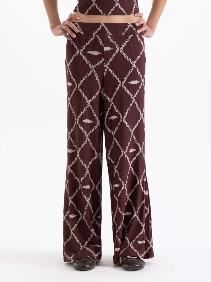 Pantalon Aurora confeccionado en tela de punto con estampado full print, de fit amplio. Lleva cintura elastizada y tabla en bota que aporta mayor amplitud y comodidad al la prenda.