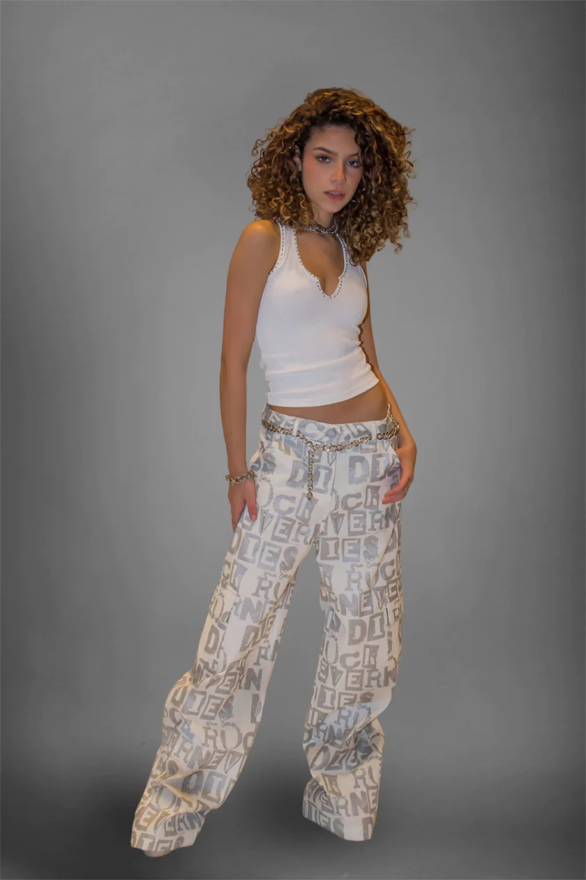 Pantalón wide leg con caída fluida, estampa lettering metalizada y bolsillos laterales. Cómodo, canchero y listo para brillar de día o de noche.