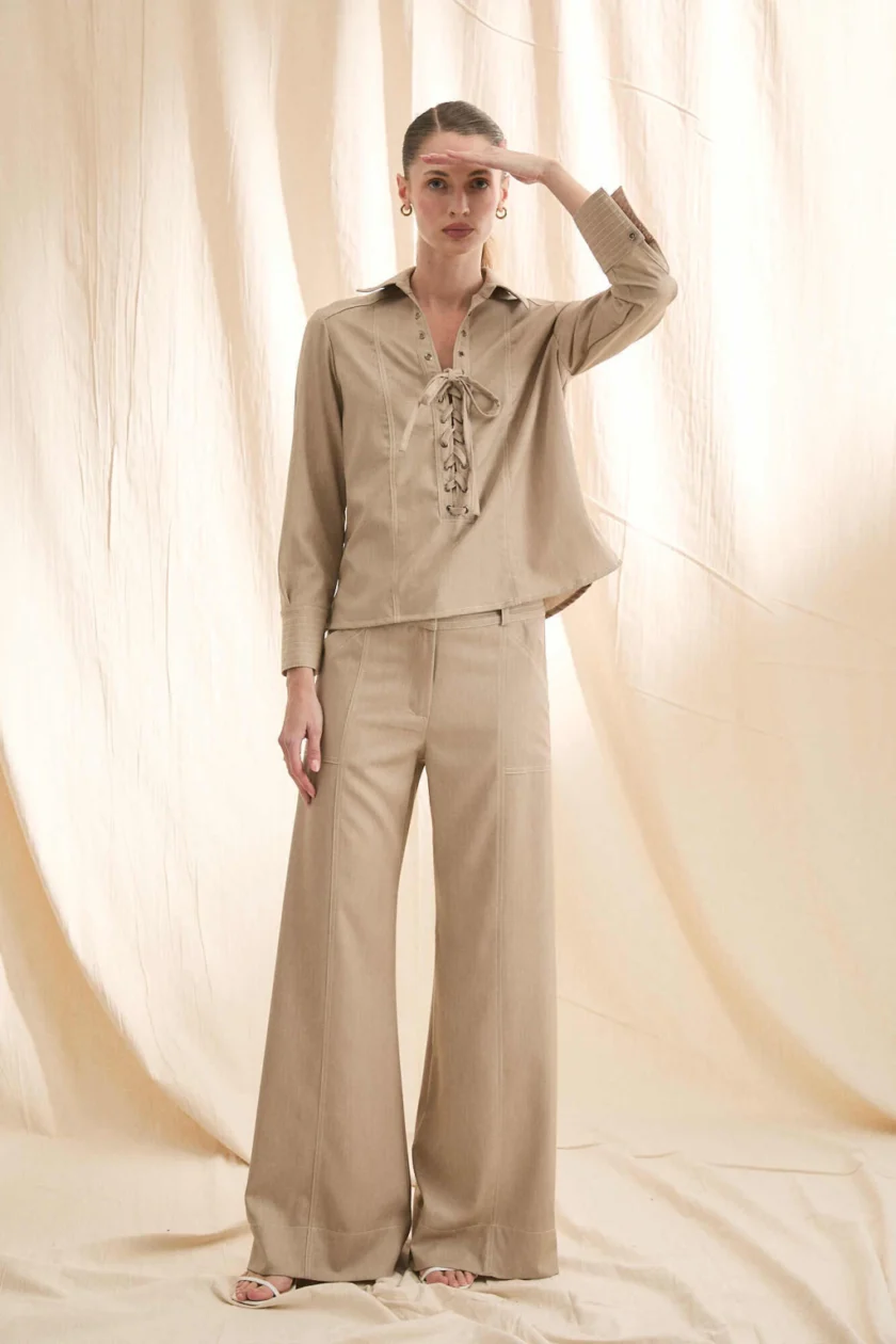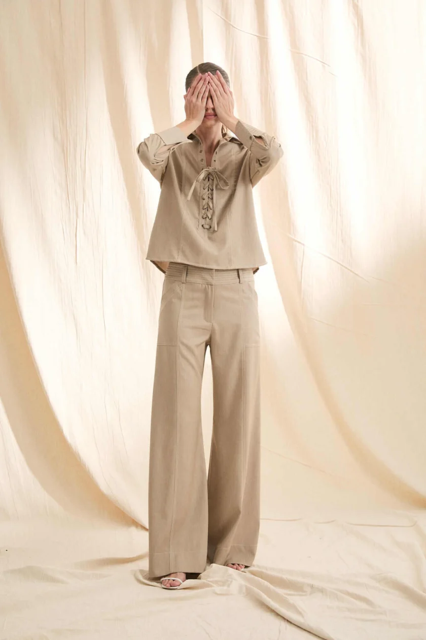 Un pantalón tiro alto con estilo oxford que combina elegancia y comodidad. Está confeccionado con una tela super liviana, ideal para lucir sofisticada sin perder frescura. Destacan sus costuras a contratono, que aportan un detalle sutil y moderno. Perfecto para armar looks formales o casuales con un toque distintivo.