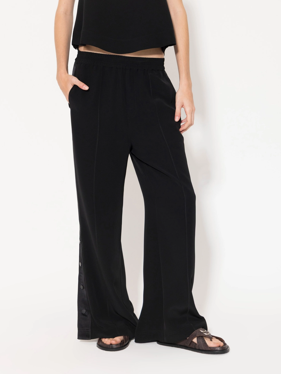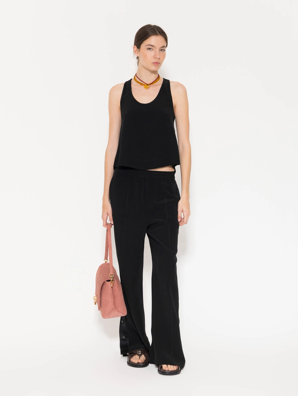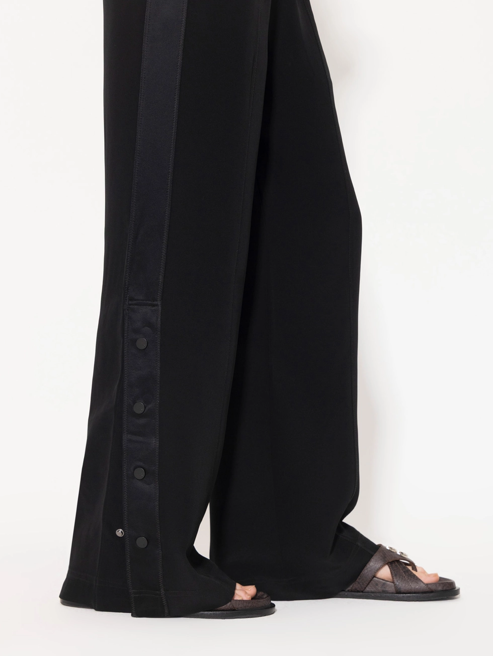 Pantalón Cairo de pata ancha confeccionado en satén doble. Lleva cintura elastizada con elástico embutido. Los laterales están terminados con piezas de tela base y broches al tono con logo JCH grabado.