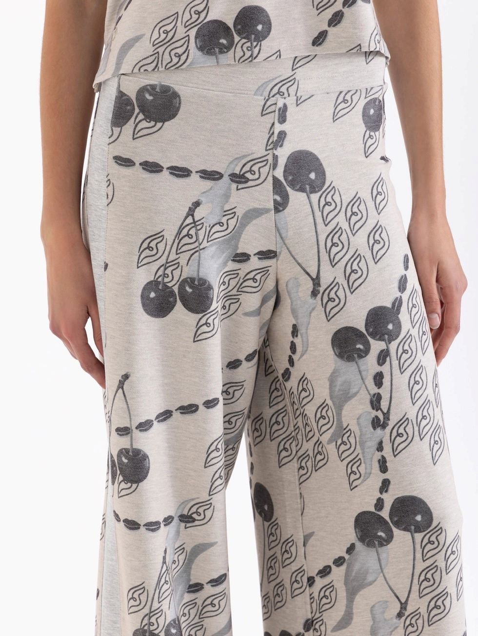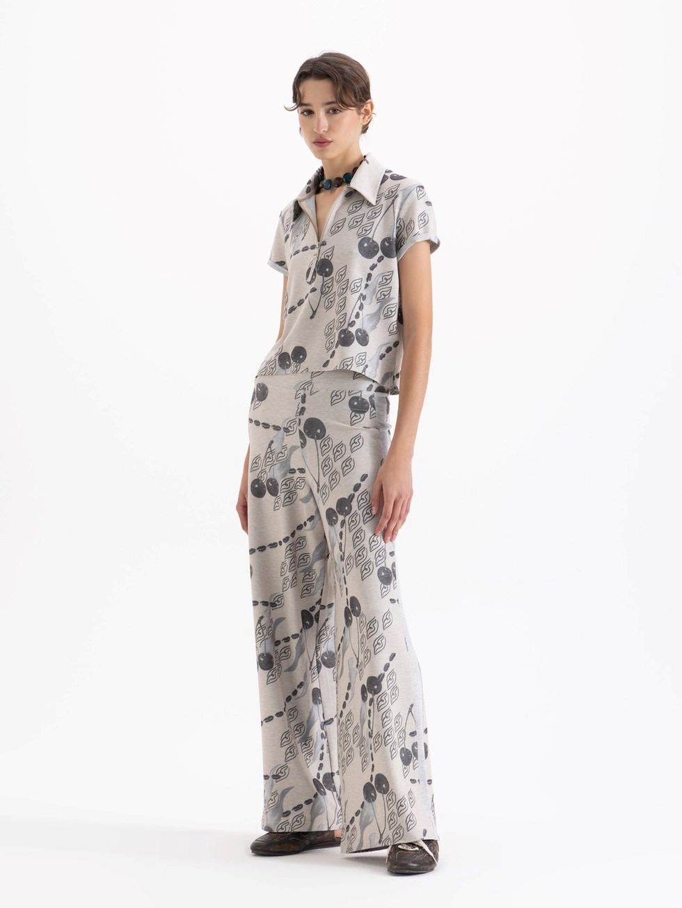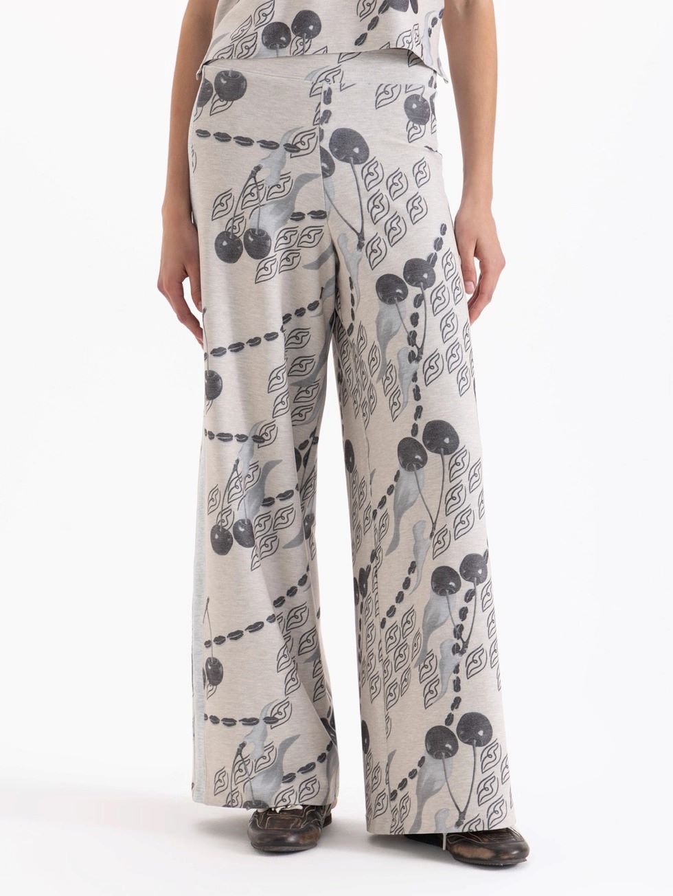 Pantalon Caroline confeccionado en tela de punto estampa full print, tiene cintura elastizada que aporta mayor comidad. Lleva recortes laterales y botomangas amplias.