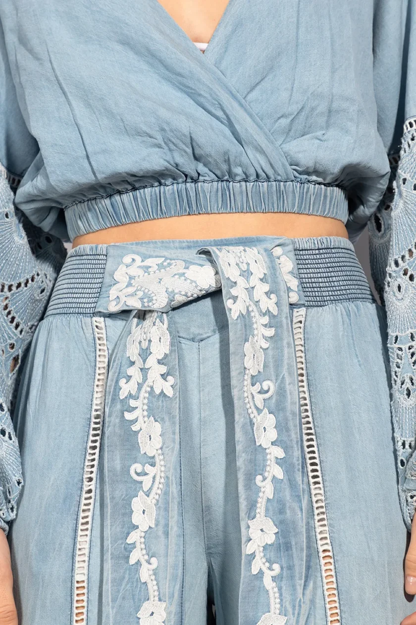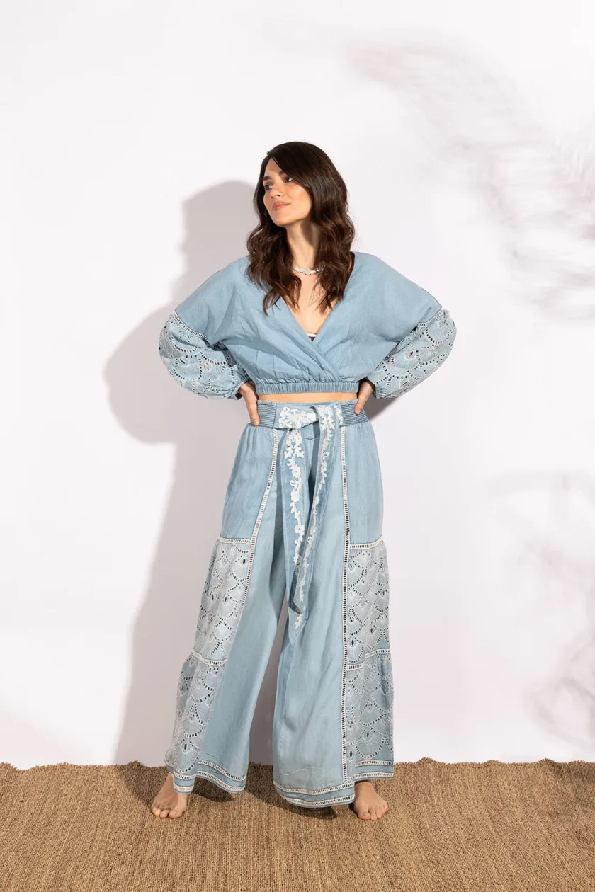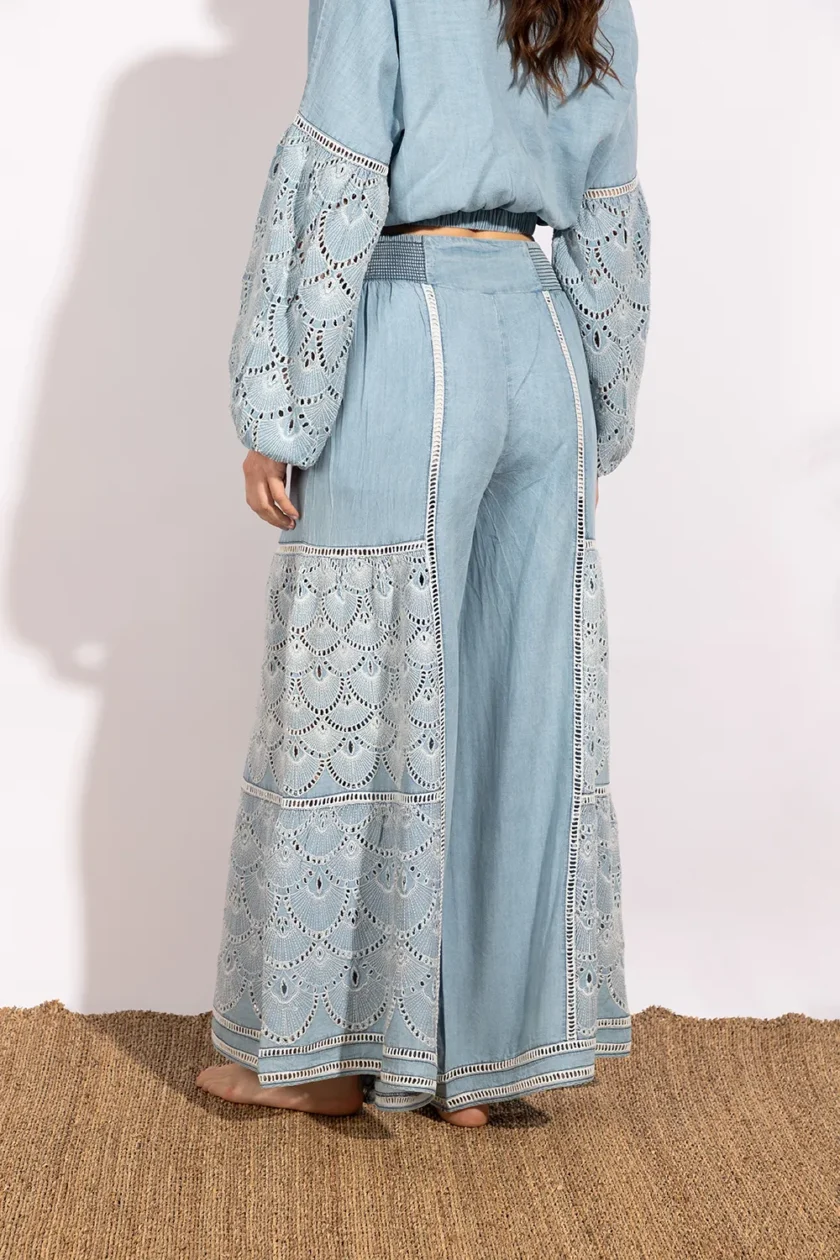Pantalón con exclusivo diseño de calados con un estilo amplio y holgado. Cuenta con cintura elástica para ajustarse al cuerpo y un gran festón bordado que crea un hermoso lazo en la parte delantera. Confeccionada con lino 100 % algodón, lo que les da un toque fresco y distinguido.