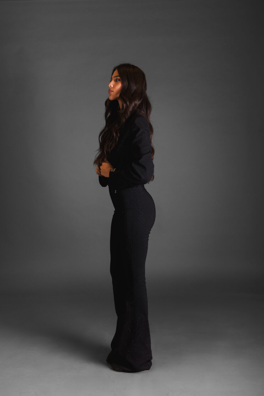 El Pantalón Crop Saratoga es un must de noche con corte al cuerpo y caída oxford que realza la figura. Hecho en tela negra con microdestellos de strass, aporta un brillo delicado y potente a la vez. Una prenda que eleva cualquier outfit con un toque de glamour contemporáneo.