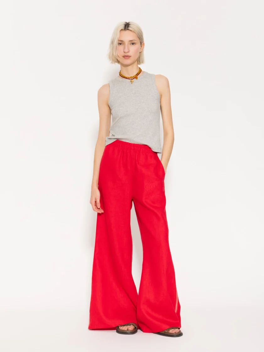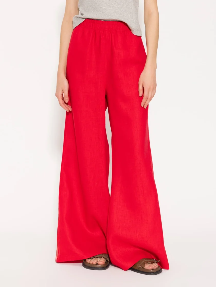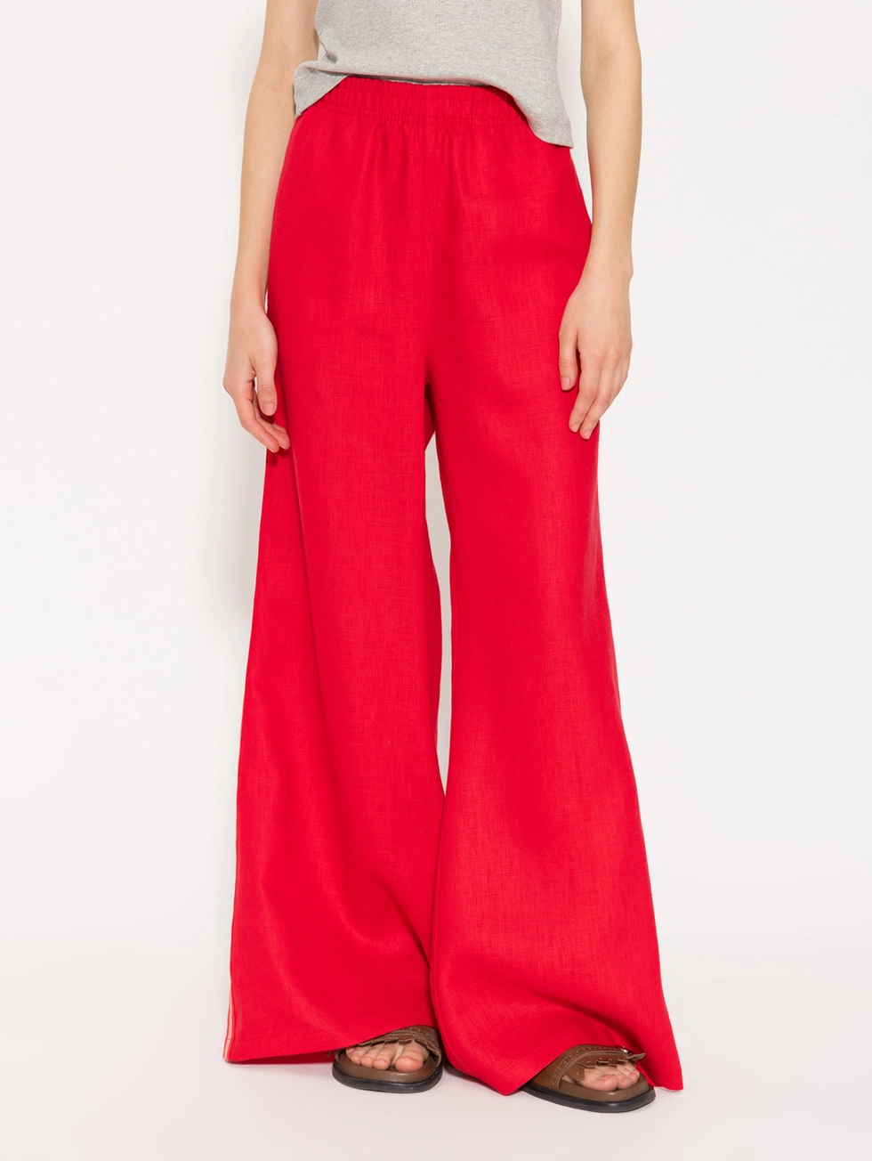 Pantalón Edimburgo de calce wide leg y tiro medio, confeccionado en lino. Su diseño incluye cintura elastizada para mayor comodidad, bolsillos delanteros y cinta espiga en laterales que suman un detalle distintivo. Una prenda fresca y versátil, ideal para looks relajados y elegantes.