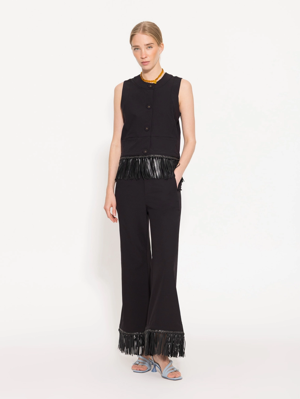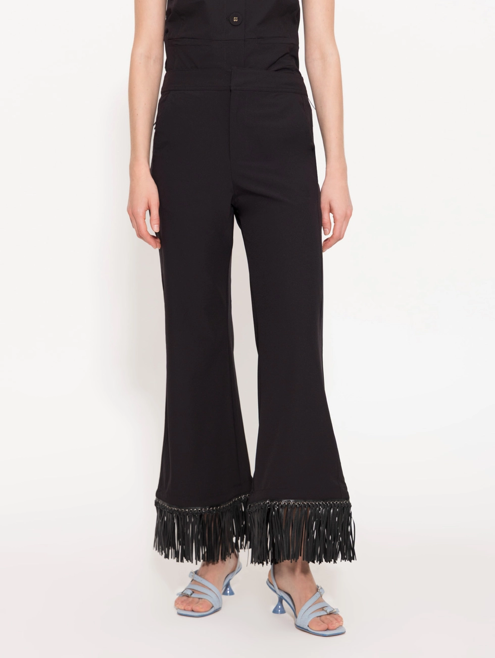 Pantalón Florence confeccionado en twill, largo hasta el tobillo. El ruedo está terminado con flecos de cuerina al tono. Su acceso mediante cierre y ganchos pantaloneros en el delantero.