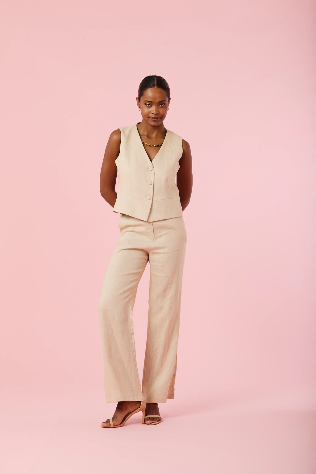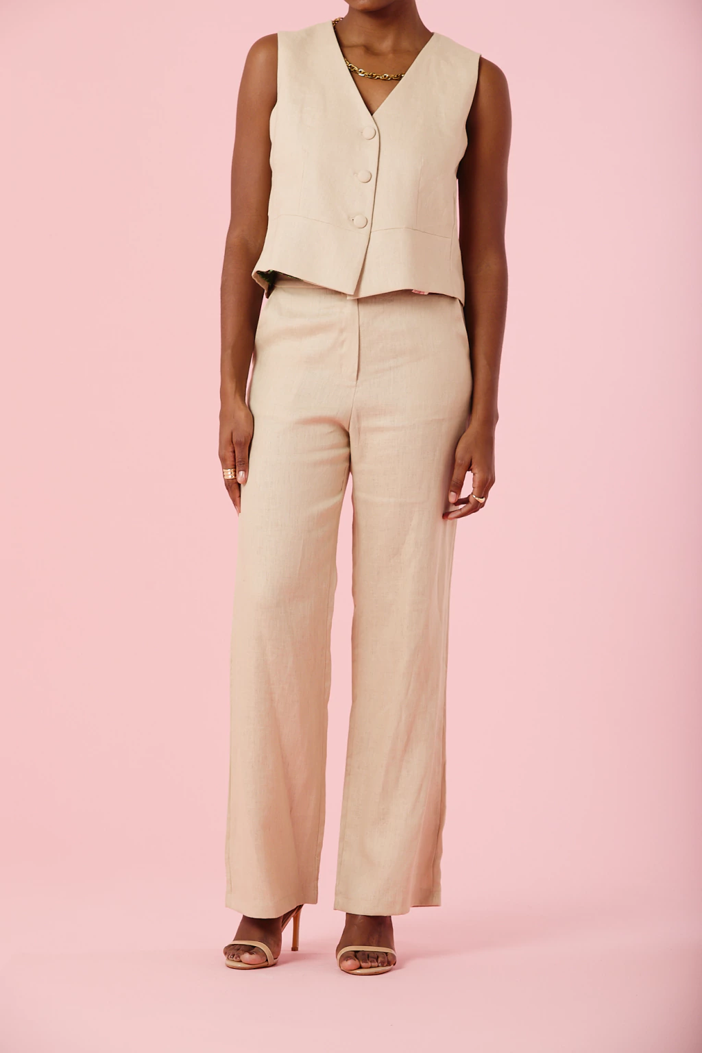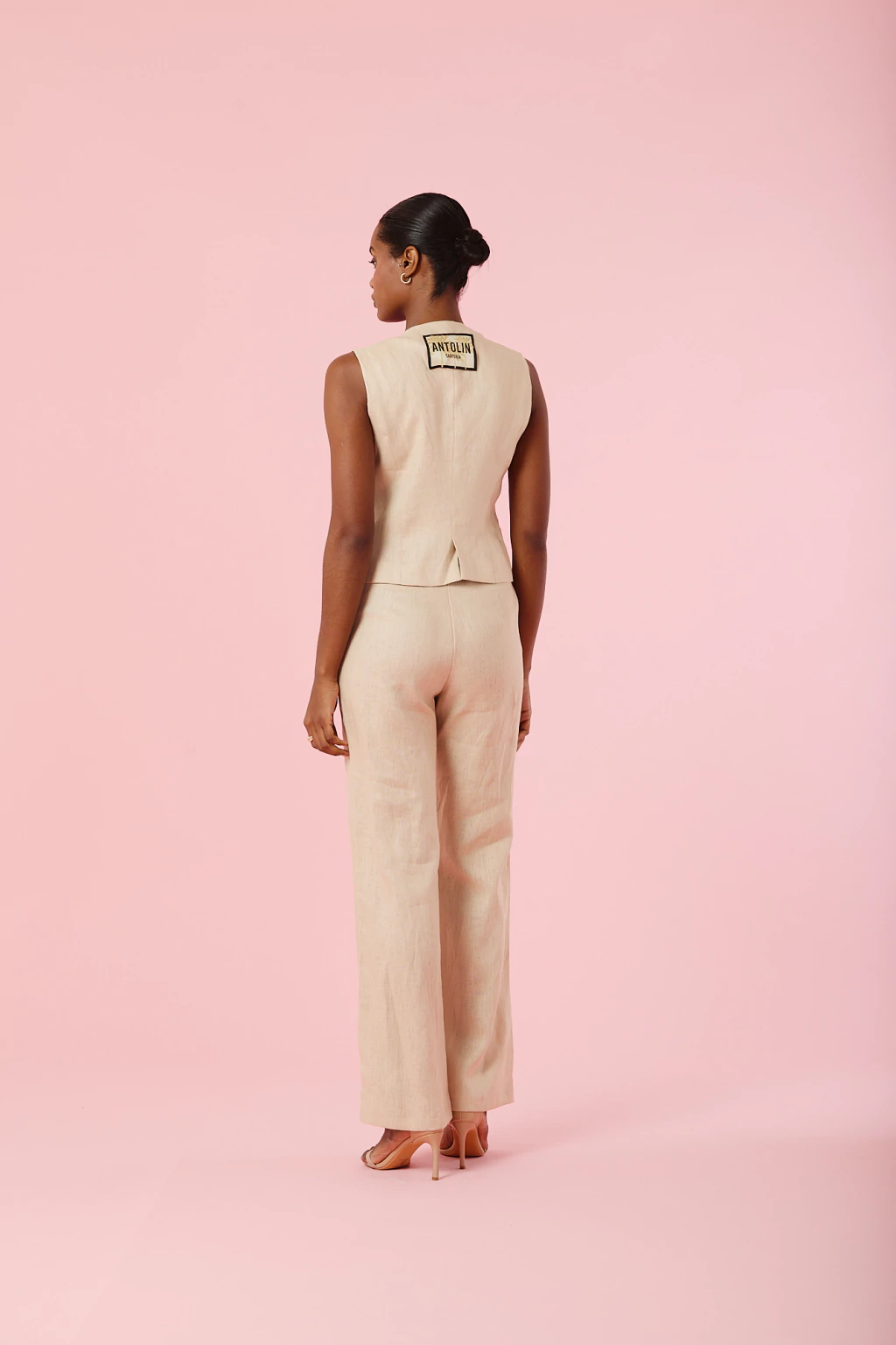 Este pantalón largo de lino combina comodidad y estilo con un diseño moderno que realza la silueta. Su corte recto y fluido permite total libertad de movimiento, mientras que la cintura interna estampada aporta un detalle sutil pero único. El lino, conocido por su frescura y suavidad, ofrece una sensación ligera y confortable, ideal para cualquier evento que requiera un look sofisticado sin perder en comodidad. Con un diseño que se adapta fácilmente a diferentes estilos, es una prenda versátil y elegante.