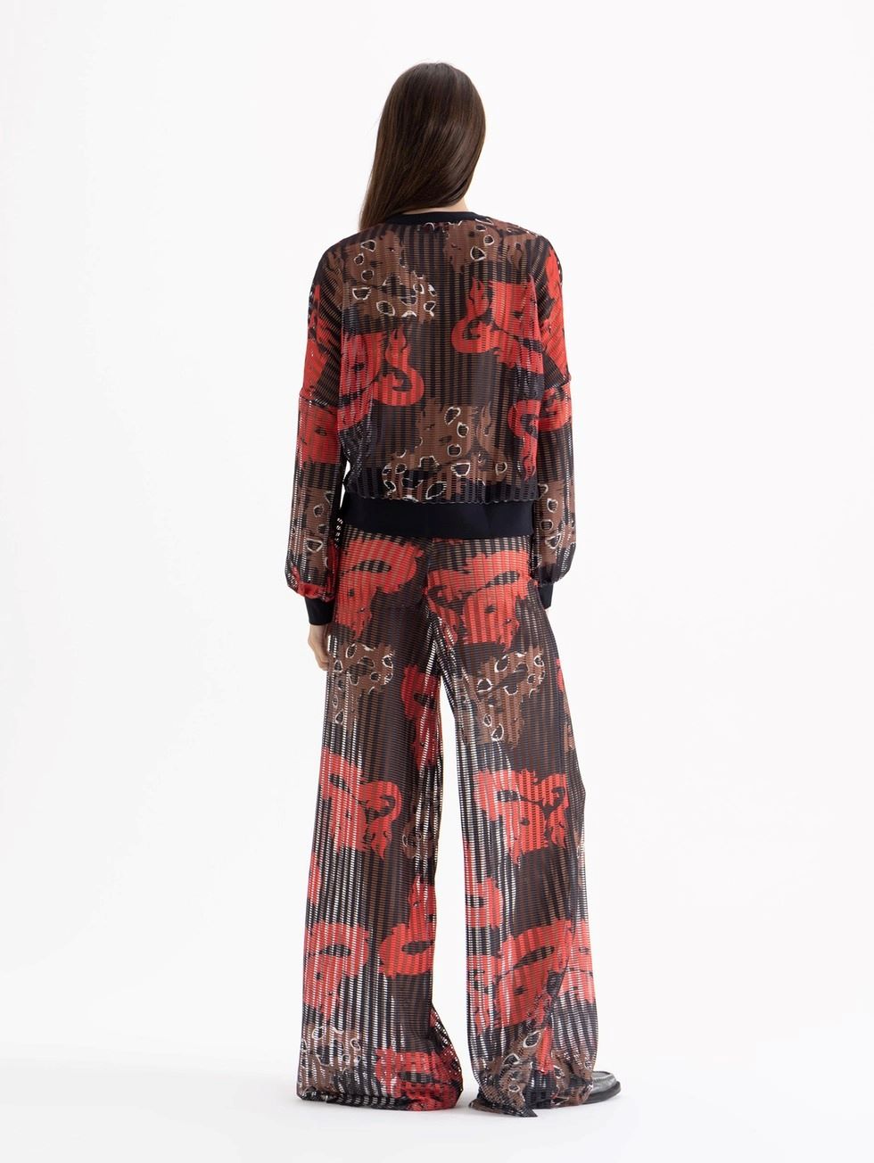 Pantalón Lexi confeccionado en tela de punto calada con estampa full print. Lleva cintura elastizada en tela complemento y bota amplia que aporta movimiento.