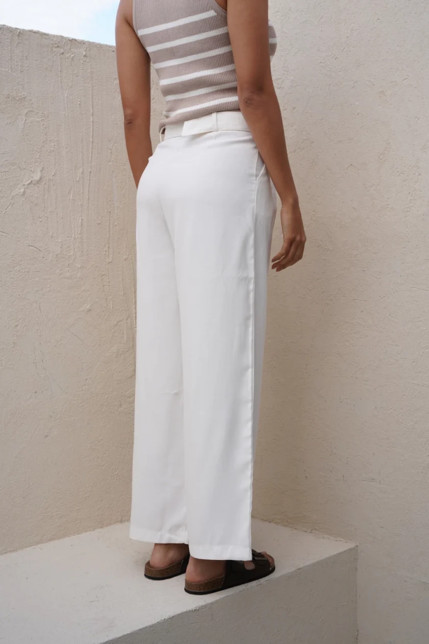 Pantalón sastrero wide leg, tiro alto, pinzado en el frente y con cinto ancho de la misma tela, con hebilla para ajustar en el frente.