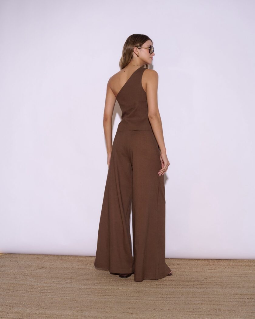 Pantalón sastrero de tiro alto confeccionado en lino. Presenta bolsillos ojal en delantero y acceso mediante cierre invisible en el lateral. Lleva falsa cintura con botón a tono, presillas en cintura y tajos en el ruedo delantero. El color crudo se encuentra íntegramente forrado.
