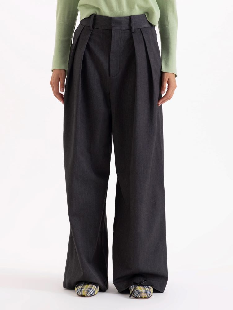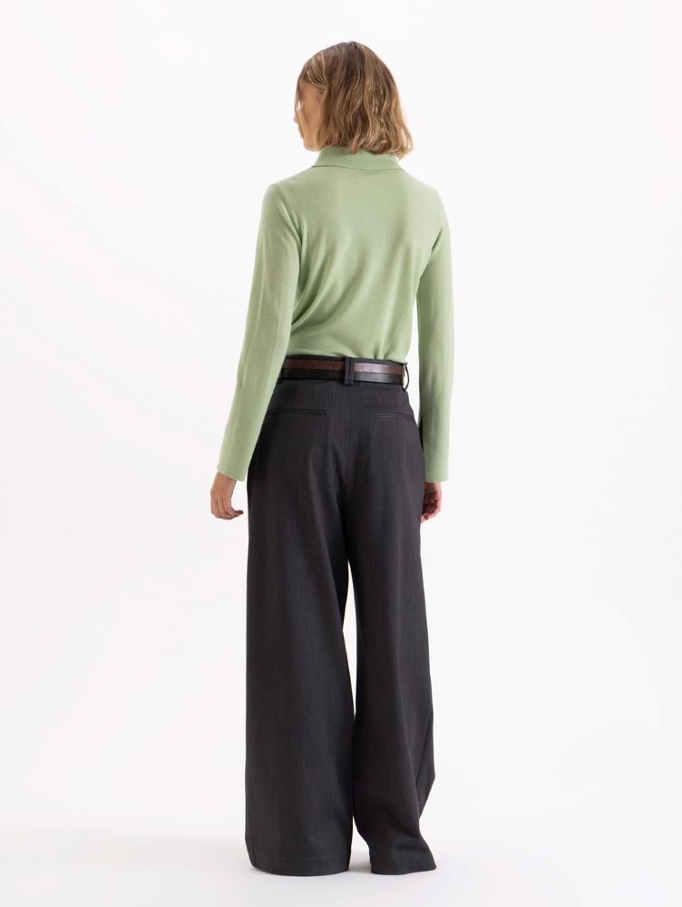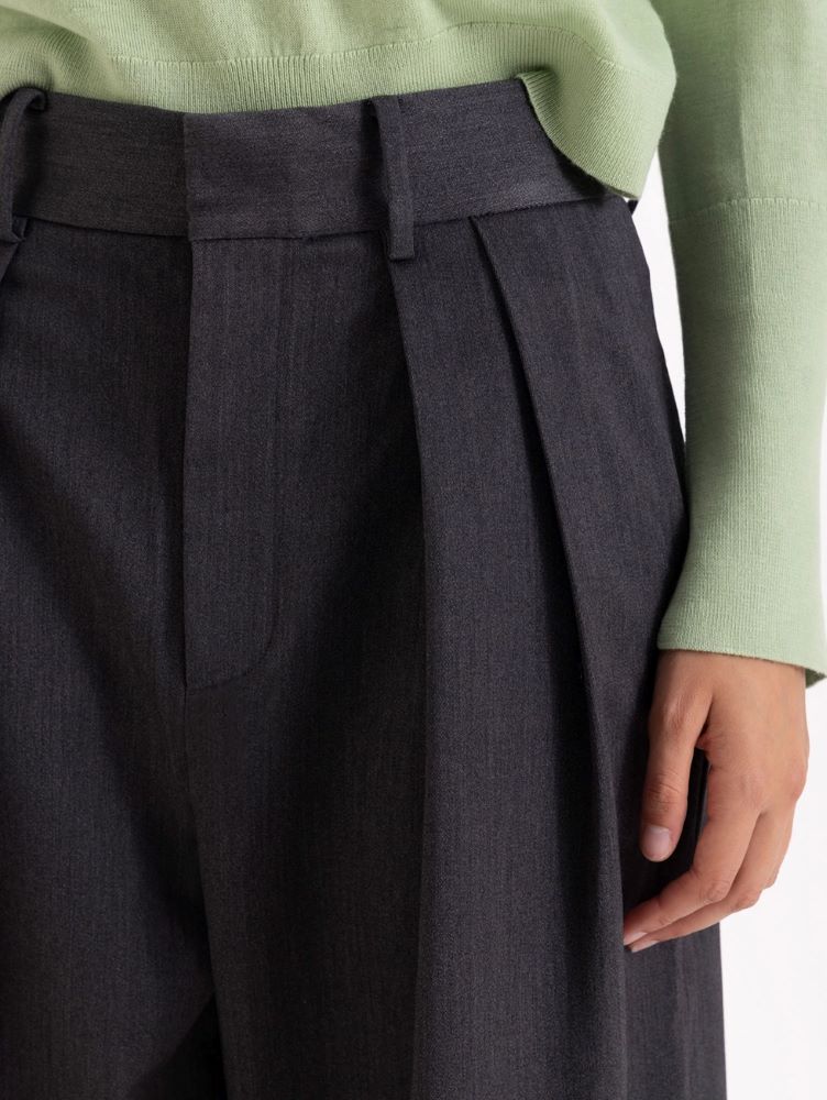 Pantalón Nicole de largo total y silueta de pata ancha, destacado por su elegante tableado en la cintura delantera. El acceso se realiza a través de un cierre metálico y ganchos pantaloneros. Posee bolsillos tanto en delantero como en la parte trasera.