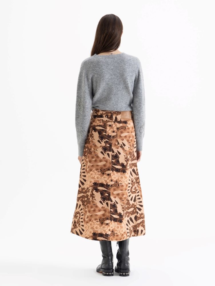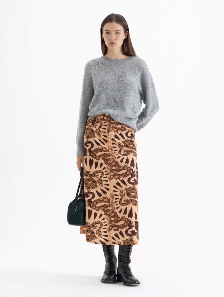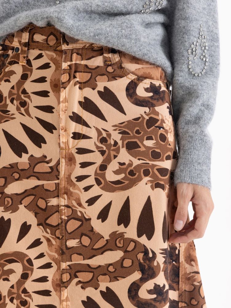 Pollera Dragones midi, amplia confeccionada en gabardina con estampado de dragones, exclusivo de esta etapa de la colección. Lleva cinco bolsillos clásicos de inspiración jeanera. Incluye bragueta con cierre y broche soft touch al tono en la cintura.