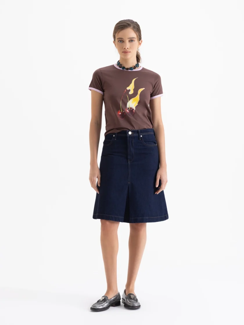 Pollera Kendric de largo midi confeccionada en denim azul de lavado oscuro. Su tejido aporta una textura suave y caída fluida. Leva una tabla central en el frente, generando una delicada línea en forma de “A” acompañando el movimiento.