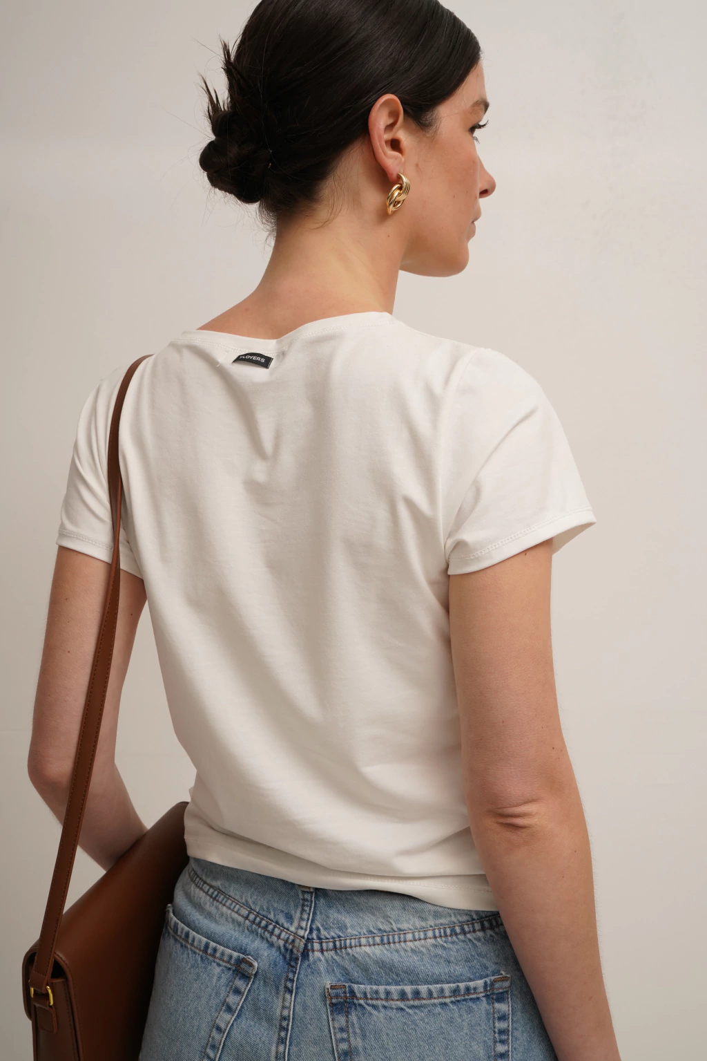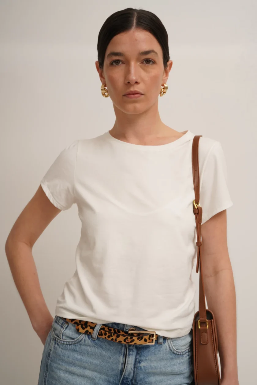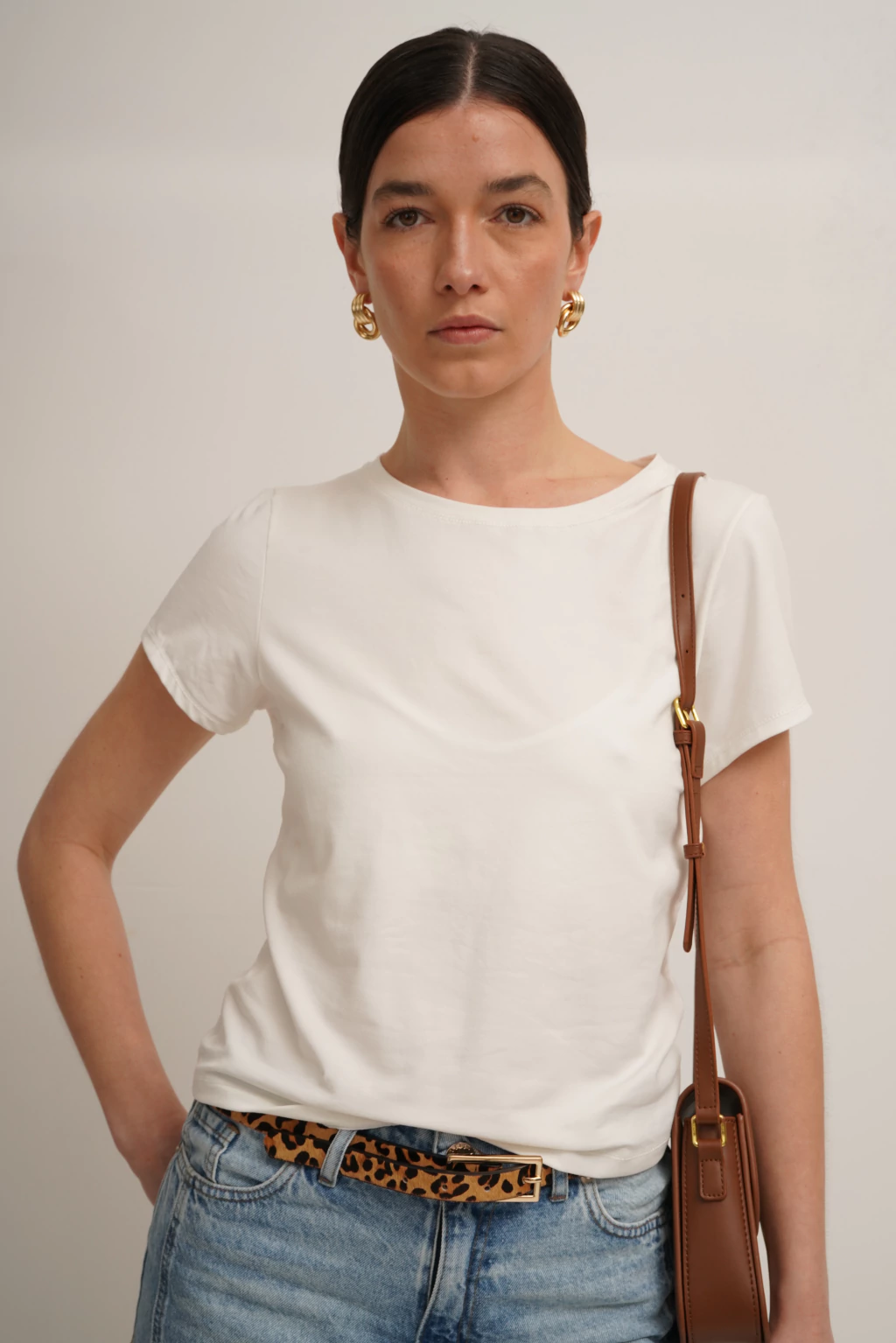 Remera de fit clásico, ajustada al cuerpo, con escote redondo y mangas cortas. Confeccionada en algodón con lycra para mayor comodidad y elasticidad. Pampa usa talle S completa el look con Jean London Lamar