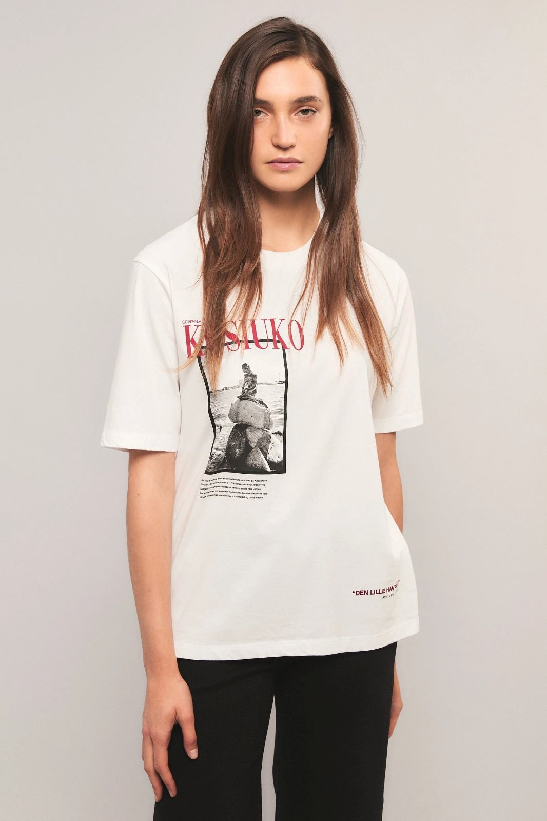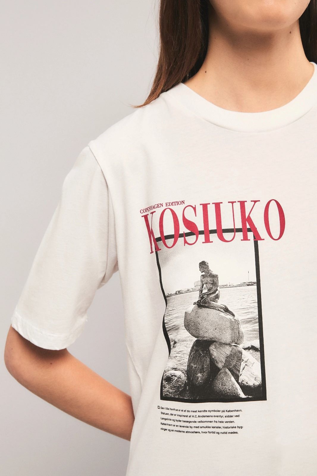 La remera Copenhagen Edition tiene calce oversize, escote redondo, mangas cortas hasta el codo y largo hasta la cadera. Esta confeccionada en jersey de Algodón. Lleva estampa en el delantero exclusiva de la coleccion. Inés está usando en la prenda superior un talle S, y en la prenda inferior un talle S/26. Sus medidas son: Altura 1.75 m. Busto 75 cm. Cintura 65cm. Cadera 90cm.