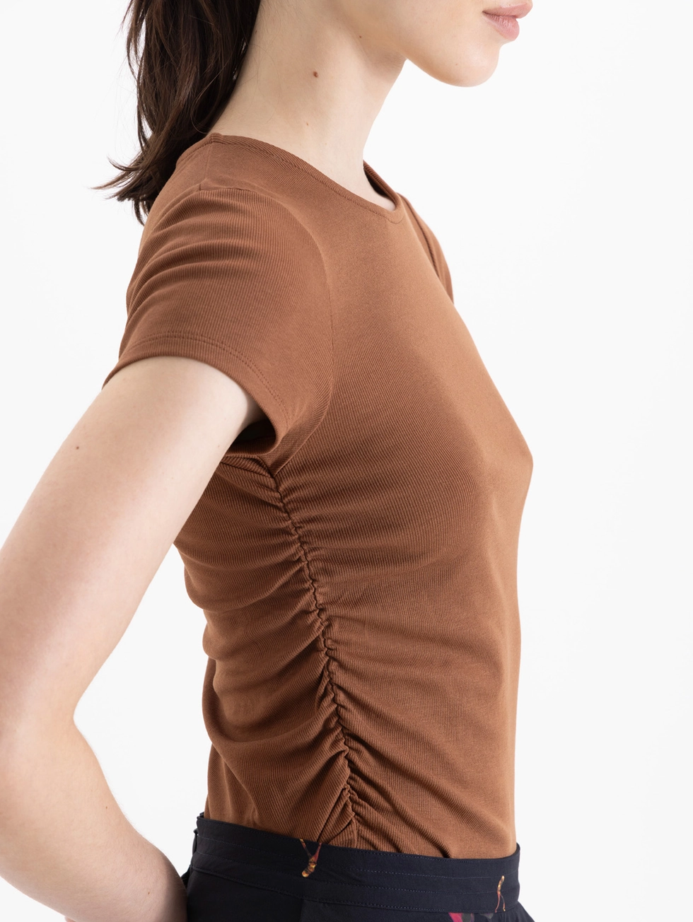 Remera Delfina confeccionada en morley de punto y mangas cortas, es de escote redondo y lleva frunce en laterales.