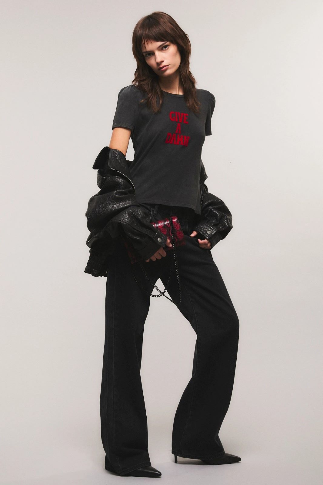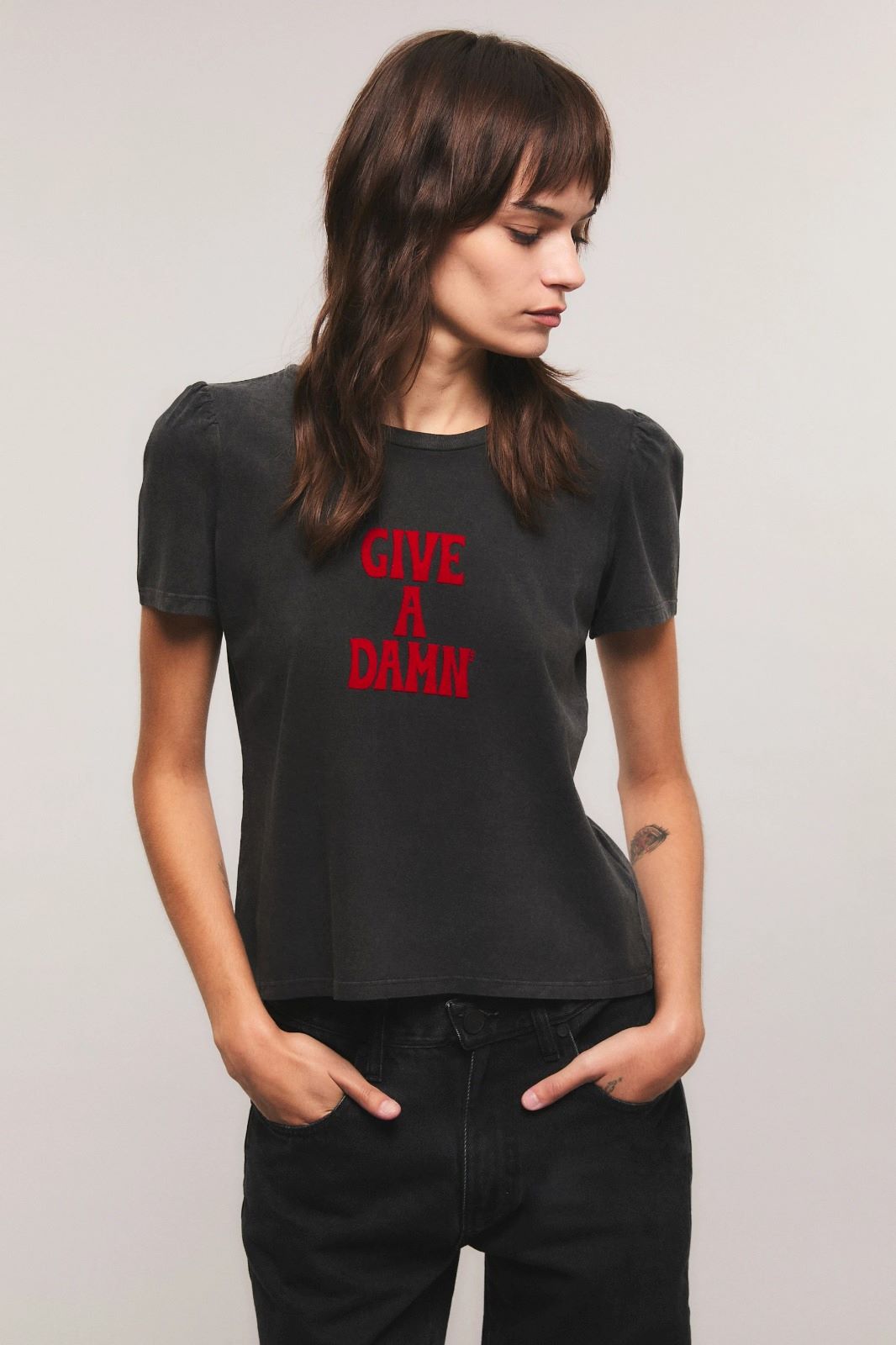 La remera Give A Damn tiene calce slim, escote redondo, mangas cortas con frunces en la copa, largo hasta la cadera. Está confeccionada en jersey de agodon. Tiene estampa en el delantero exclusiva de la colección en técnica flock. Miranda está usando en la prenda superior un talle S, y en la prenda inferior un talle S/26. Sus medidas son: Altura 1.73 m. Busto 77 cm. Cintura 59cm. Cadera 85cm.