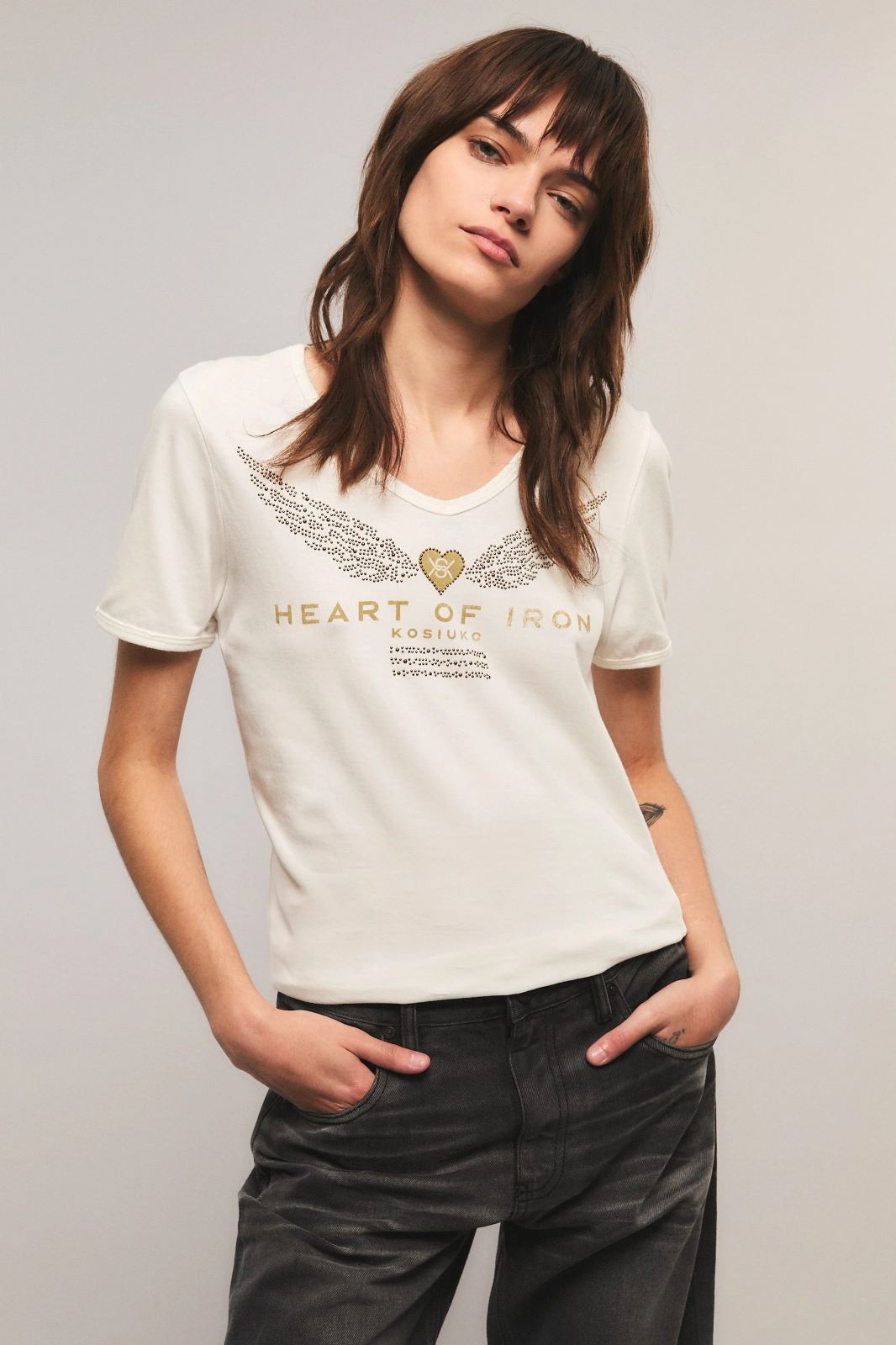 La remera Heart Of Iron tiene calce regular, cuello tipo v, mangas cortas y largo a la cintura. Tiene estampa exclusiva de la colección y decorada con tacha hotfix. Esta confeccionada en jersey de algodón. Miranda está usando en la prenda superior un talle S, y en la prenda inferior un talle S/26. Sus medidas son: Altura 1.73 m. Busto 77 cm. Cintura 59cm. Cadera 85cm.