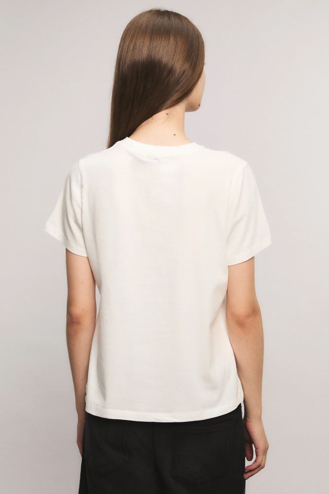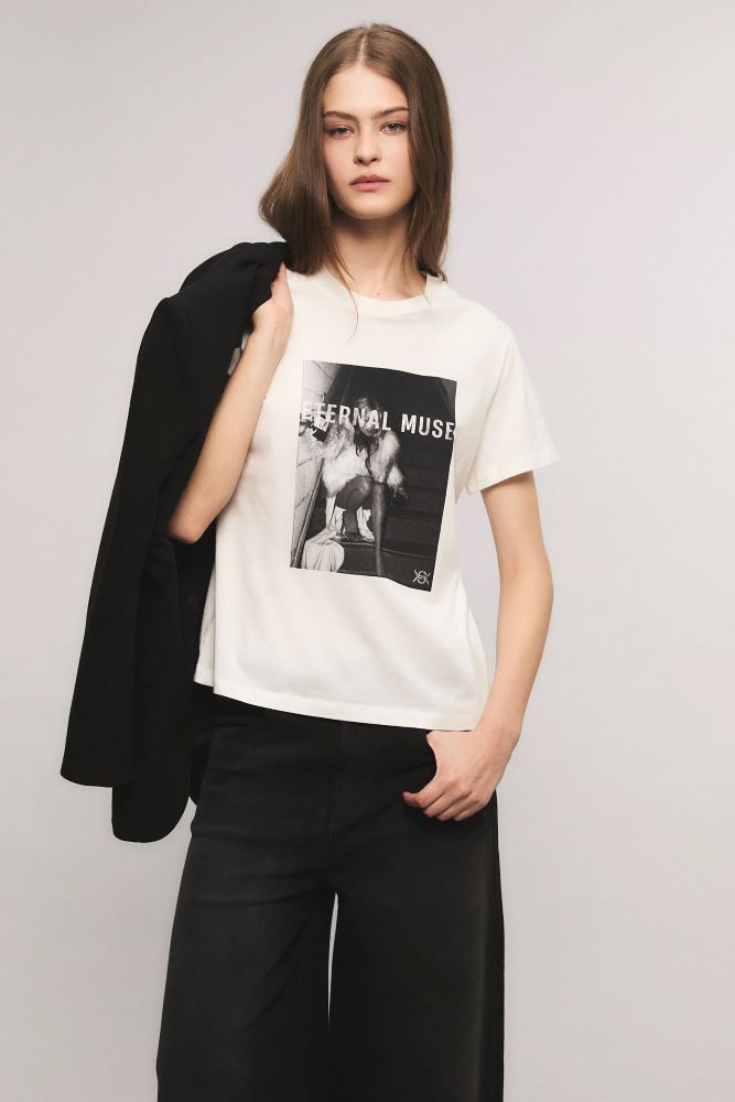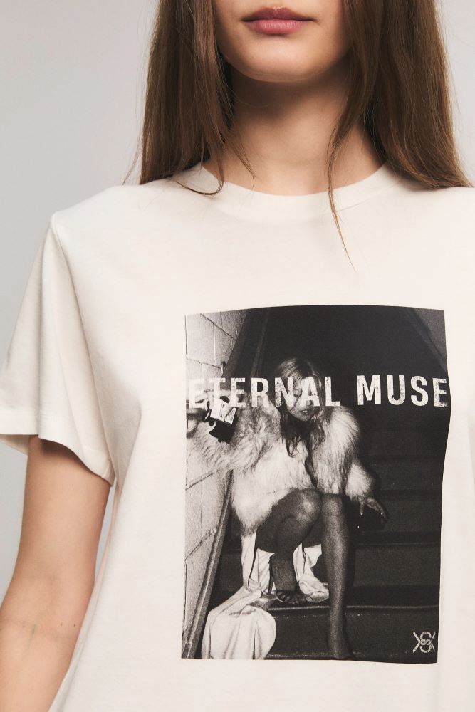 La remera Midnight Muse tiene calce regular, cuello redondo, mangas cortas y largo a la cadera. Tiene estampa exlusiva de la colección con flock roto. Esta confeccionada en jersey de algodón. Eva está usando en la prenda superior un talle S, y en la prenda inferior un talle S/26. Sus medidas son: Altura 1.78 m. Busto 78 cm. Cintura 57 cm. Cadera 86 cm.