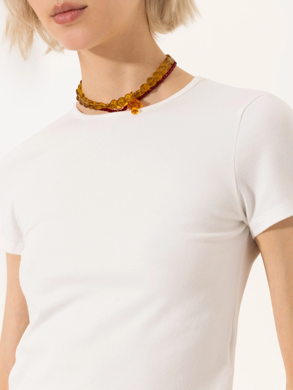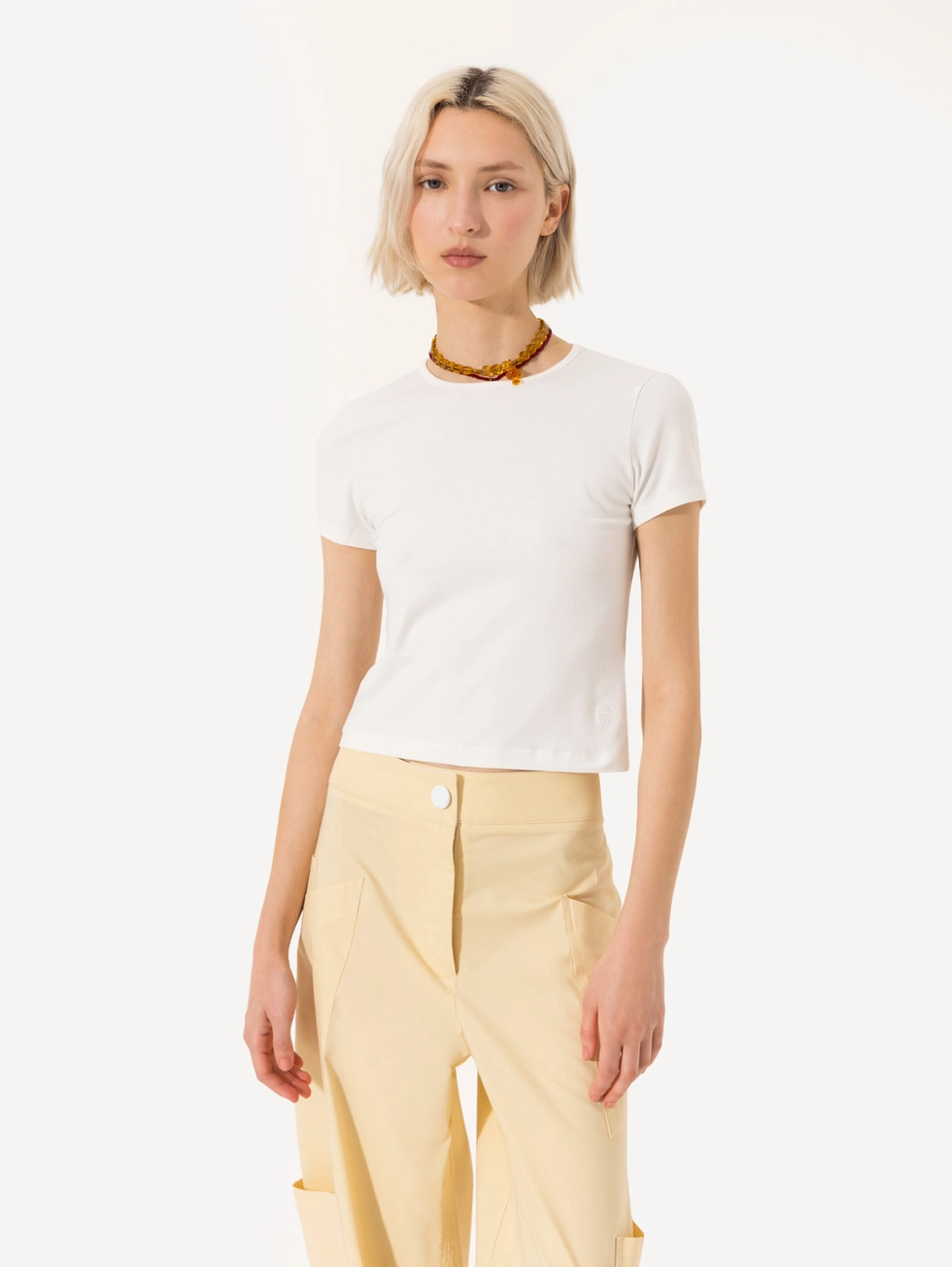 Remera Mili de calce ajustado confeccionada en algodón con elastano. Presenta escote redondo cerrado en el frente, espalda cavada y mangas cortas estilo japonés que acompañan la silueta.