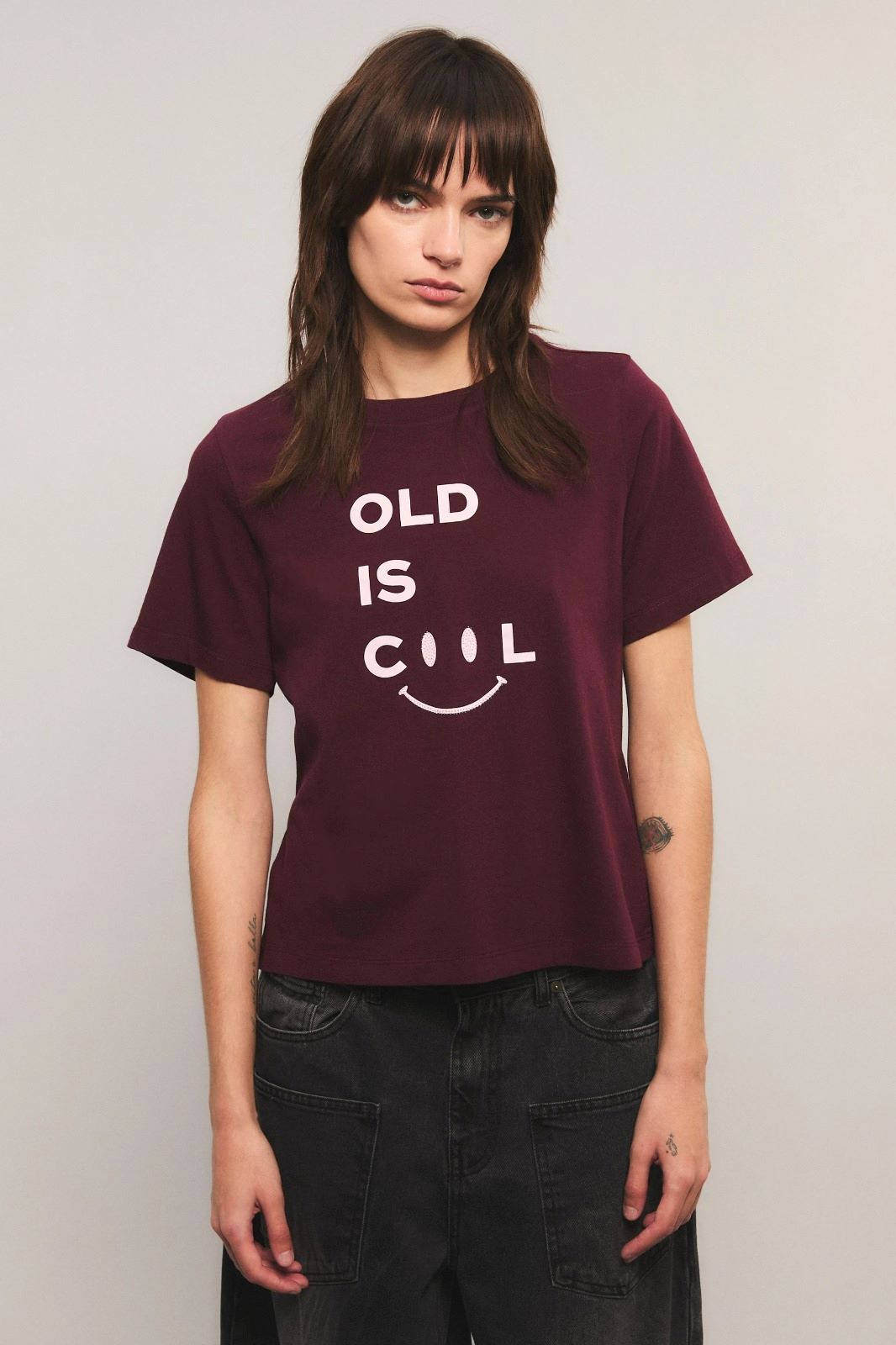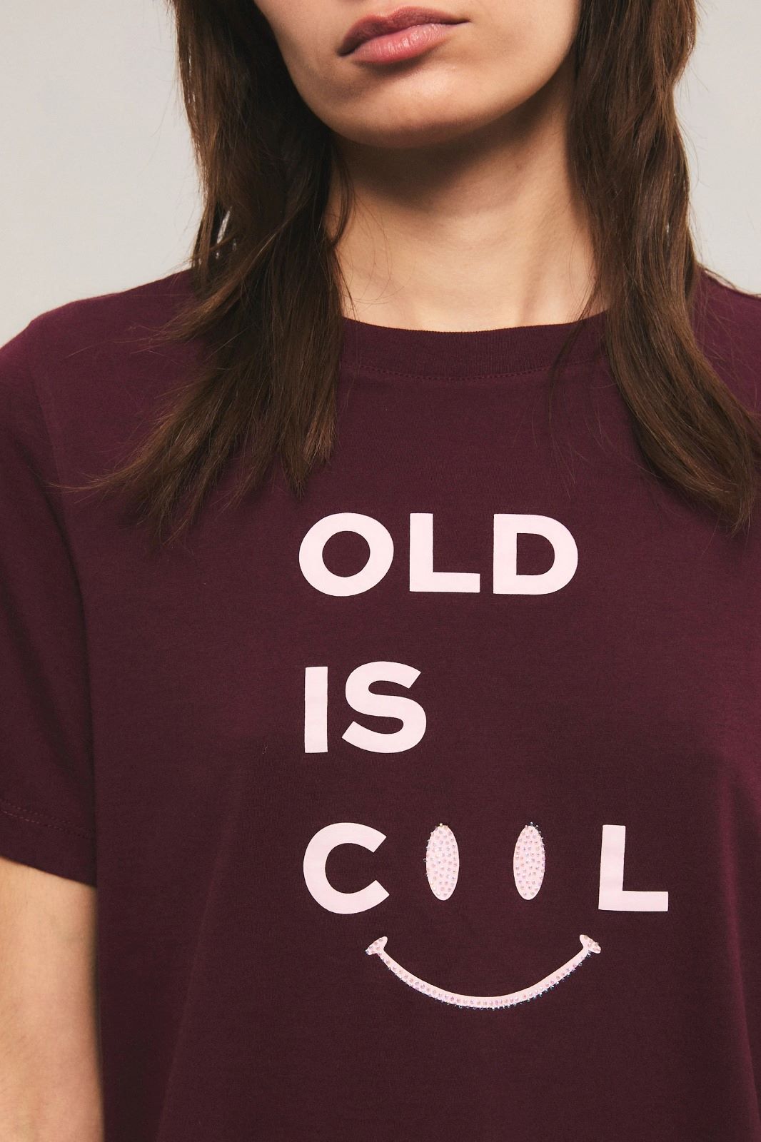 La remera Old Is Cool tiene calce regular, cuello redondo, manga corta, largo hasta la cadera. Esta confeccionada en jersey de algodón. Tiene estampa de la exclusivo de la colección en el delantero. Miranda está usando en la prenda superior un talle S, y en la prenda inferior un talle S/26. Sus medidas son: Altura 1.73 m. Busto 77 cm. Cintura 59cm. Cadera 85cm.