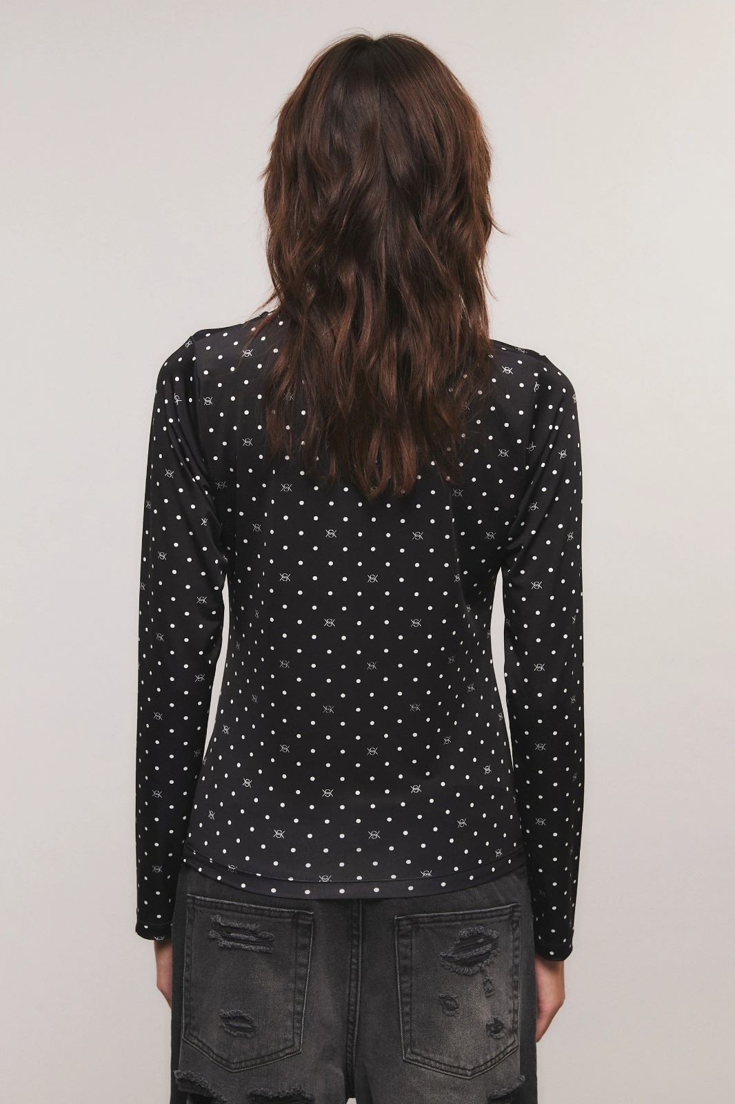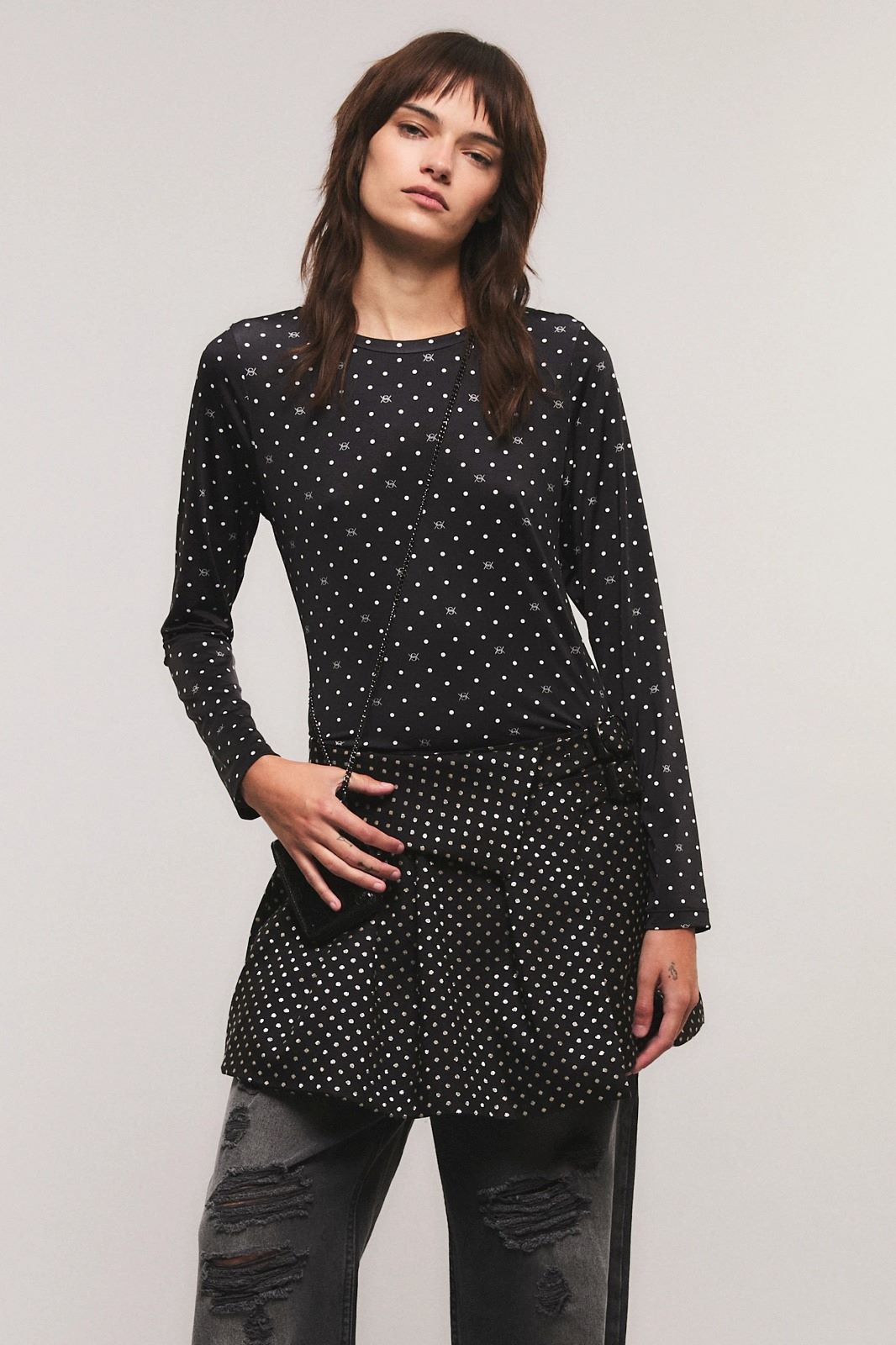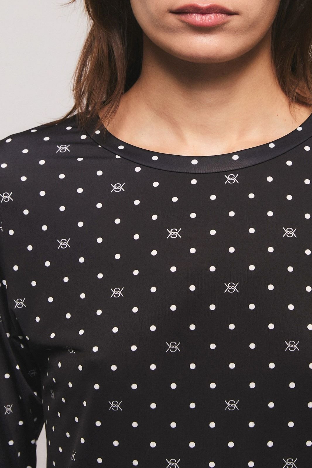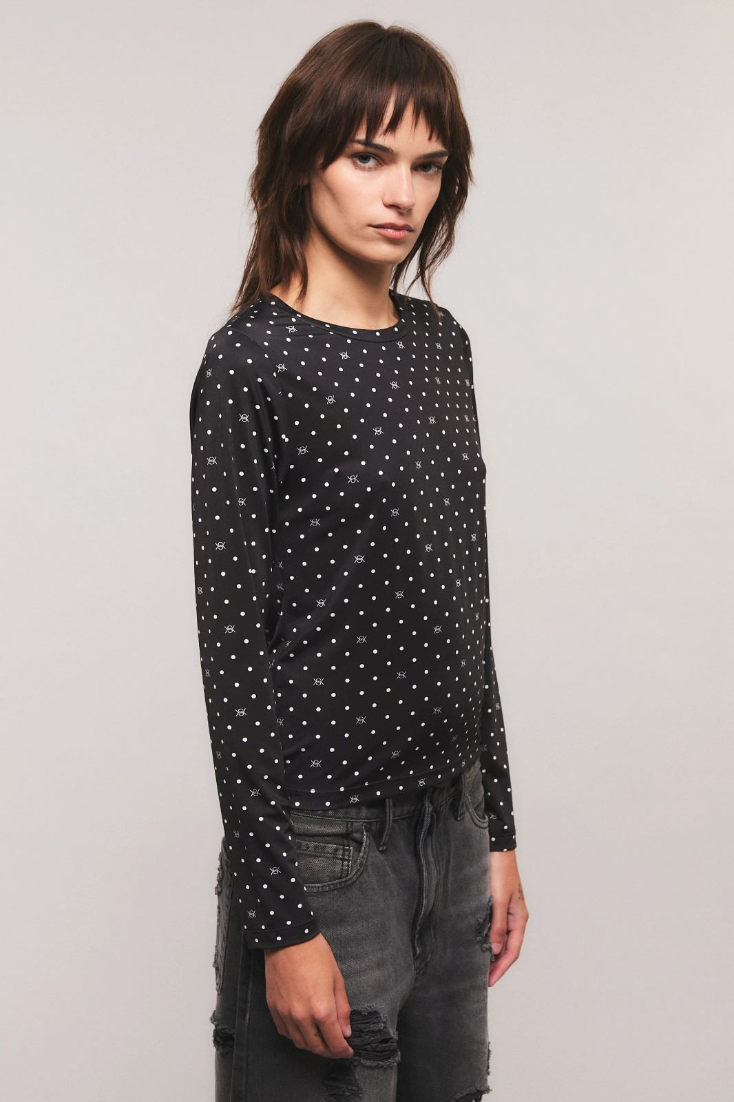La remera Polka es de calce regular, largo a la cintura y mangas largas. Está prenda está confeccionada en microfibra suave al tacto, subliminada con estampa exclusiva de la coleción. Miranda está usando en la prenda superior un talle S, y en la prenda inferior un talle S/26. Sus medidas son: Altura 1.73 m. Busto 77 cm. Cintura 59cm. Cadera 85cm.