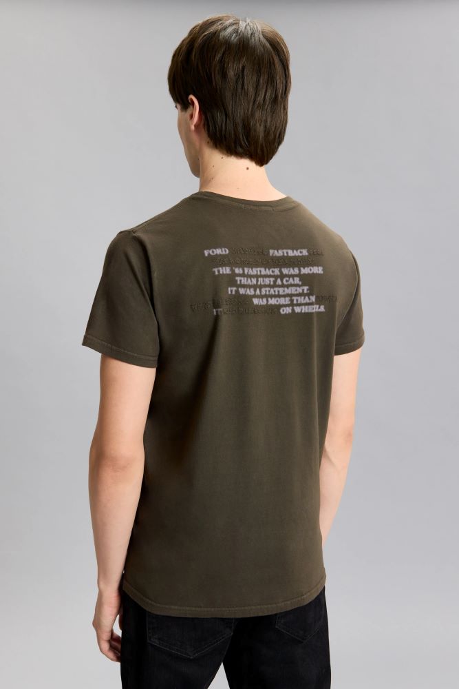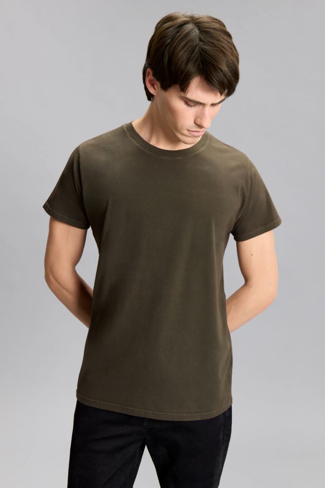 Remera mangas cortas, de calce regular. Confeccionada en jersey de algodón, con ribb al tono en cuello. Estampada y bordada en espalda. Prenda con proceso de color teñido. Nacho está usando en la prenda superior un talle M, y en la prenda inferior un talle S/30. Su altura es de 1.85 m.