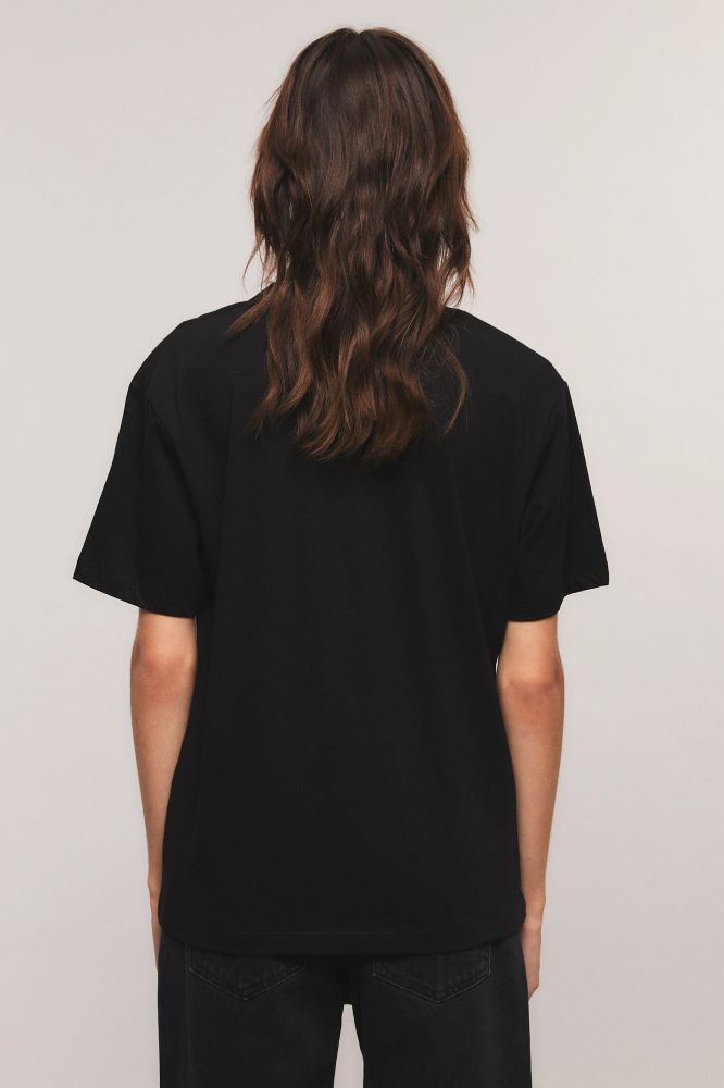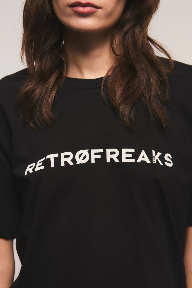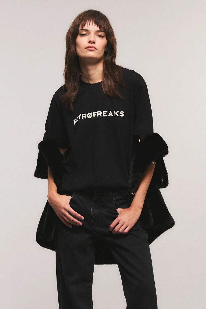 La remera Retrofreaks tiene calce oversize, cuello redondo, mangas cortas y largo a la cadera. Tiene estampa exclusiva de la colección. Está confeccionada en jersey de algodón. Miranda está usando en la prenda superior un talle S, y en la prenda inferior un talle S/26. Sus medidas son: Altura 1.73 m. Busto 77 cm. Cintura 59cm. Cadera 85cm.