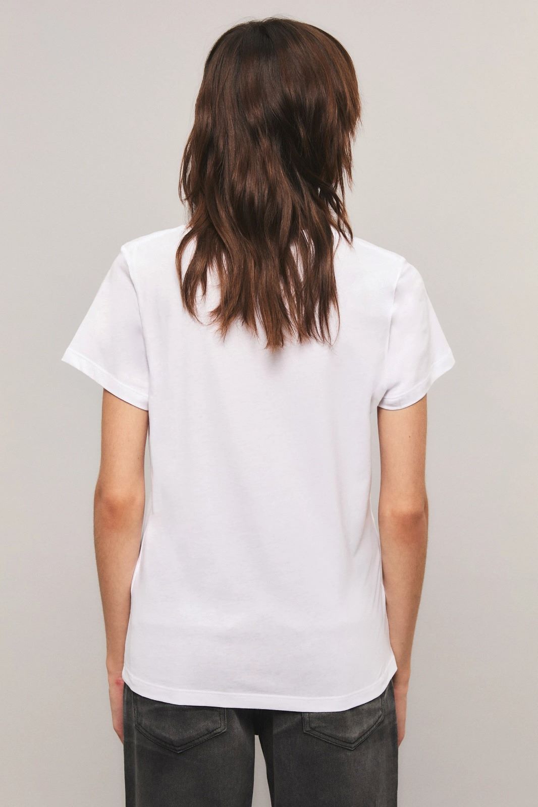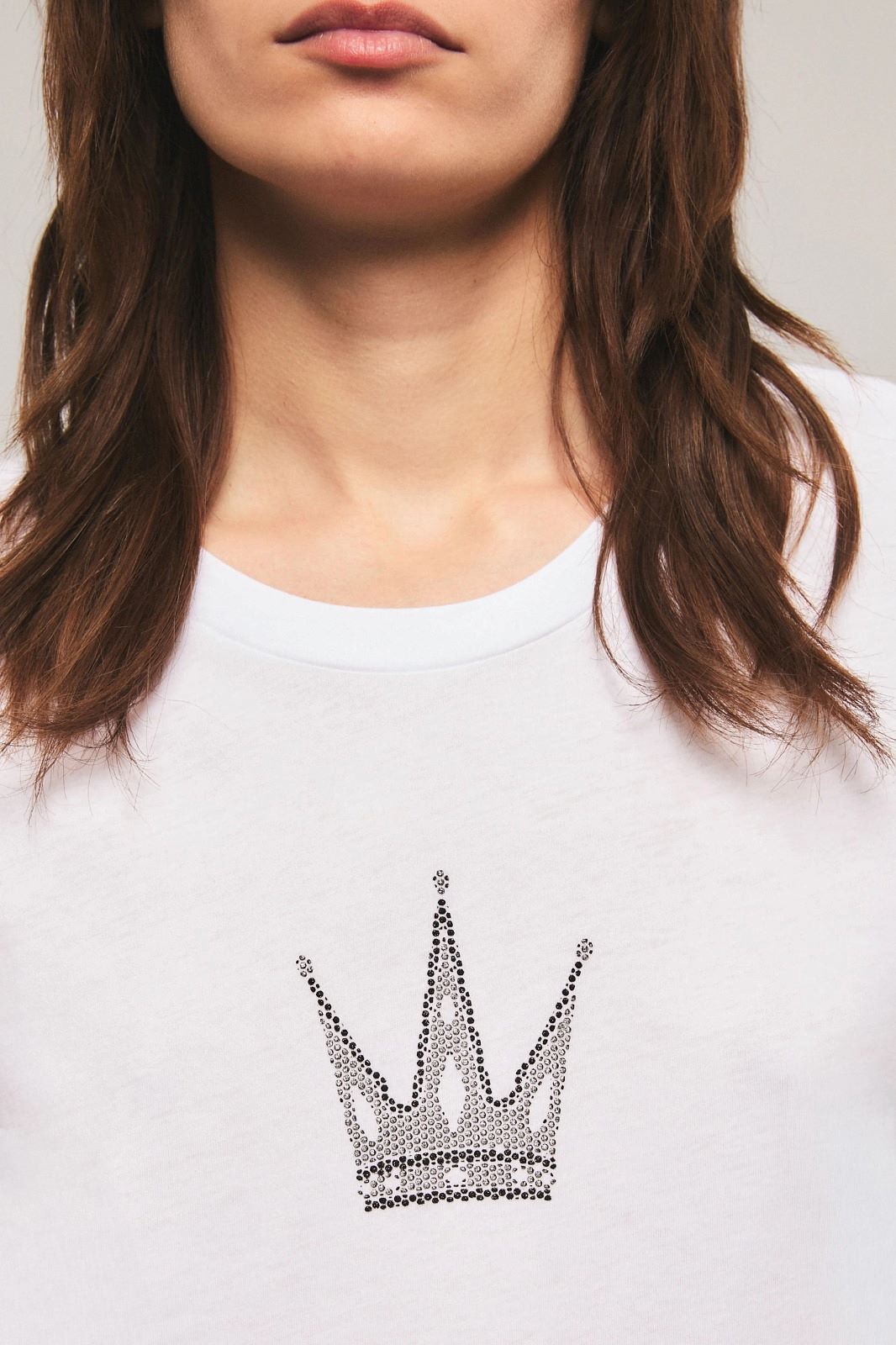 La remera Shiny Crown tiene un calce regular con cuello redondo y manga corta. Posee estampa única de la colección con glitter en altura y esta confeccionada en jersey de algodón. Miranda está usando en la prenda superior un talle S, y en la prenda inferior un talle S/26. Sus medidas son: Altura 1.73 m. Busto 77 cm. Cintura 59cm. Cadera 85cm.