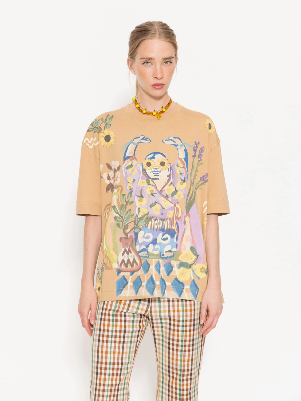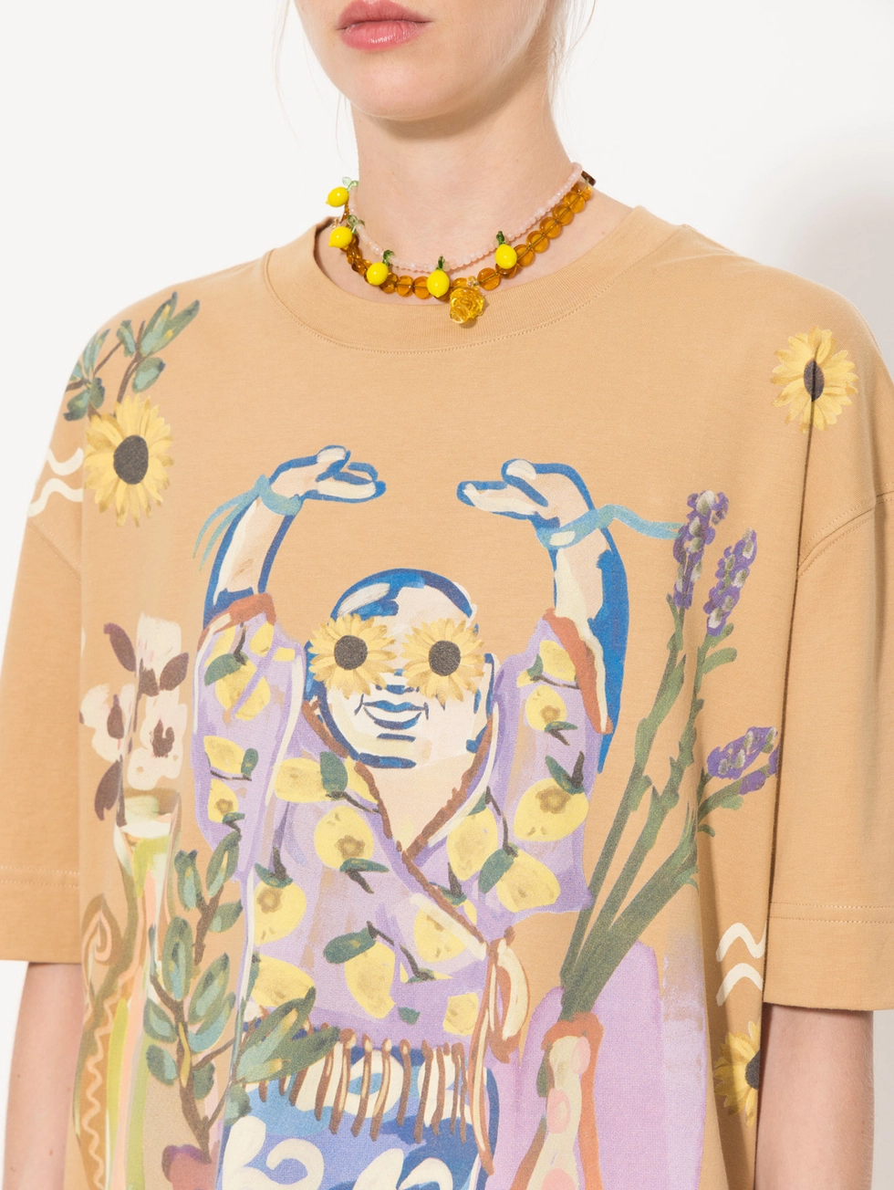 Remera Simon de fit amplio, larga a la cadera. Es de mangas cortas y cuello redondo. Lleva estampa en delantero y el logo bordado en la espalda.