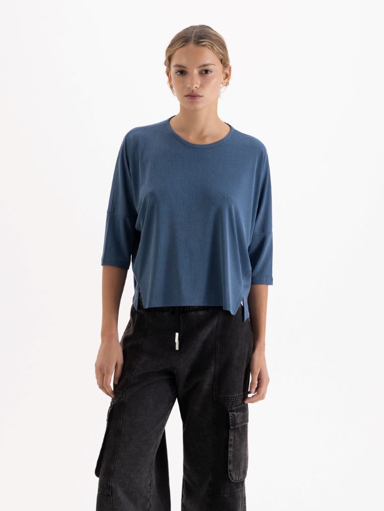 Remera Sori de silueta relajada realizada en tela de punto de gran suavidad. Presenta un diseño funcional con escote redondo y mangas 3/4, un recorte estratégico en la espalda y tajos laterales que aportan movimiento y una caída fluida a la prenda.