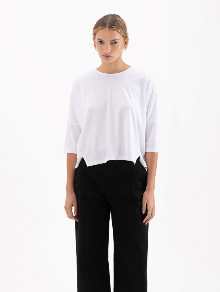 Remera Sori de silueta relajada realizada en tela de punto de gran suavidad. Presenta un diseño funcional con escote redondo y mangas 3/4, un recorte estratégico en la espalda y tajos laterales que aportan movimiento y una caída fluida a la prenda.
