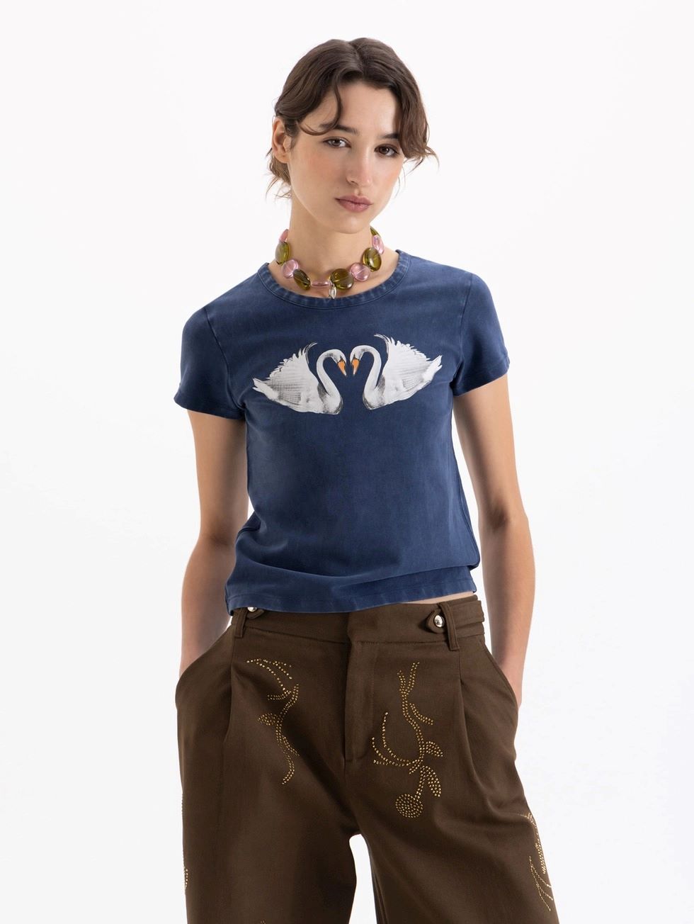 Remera Swan al cuerpo de largo a la primera cadera, con cuello redondo a la base y mangas cortas. El diseño incluye una estampa en el delantero y logo bordado en la espalda. El toque de elastano permite un calce más cómodo y favorecedor.