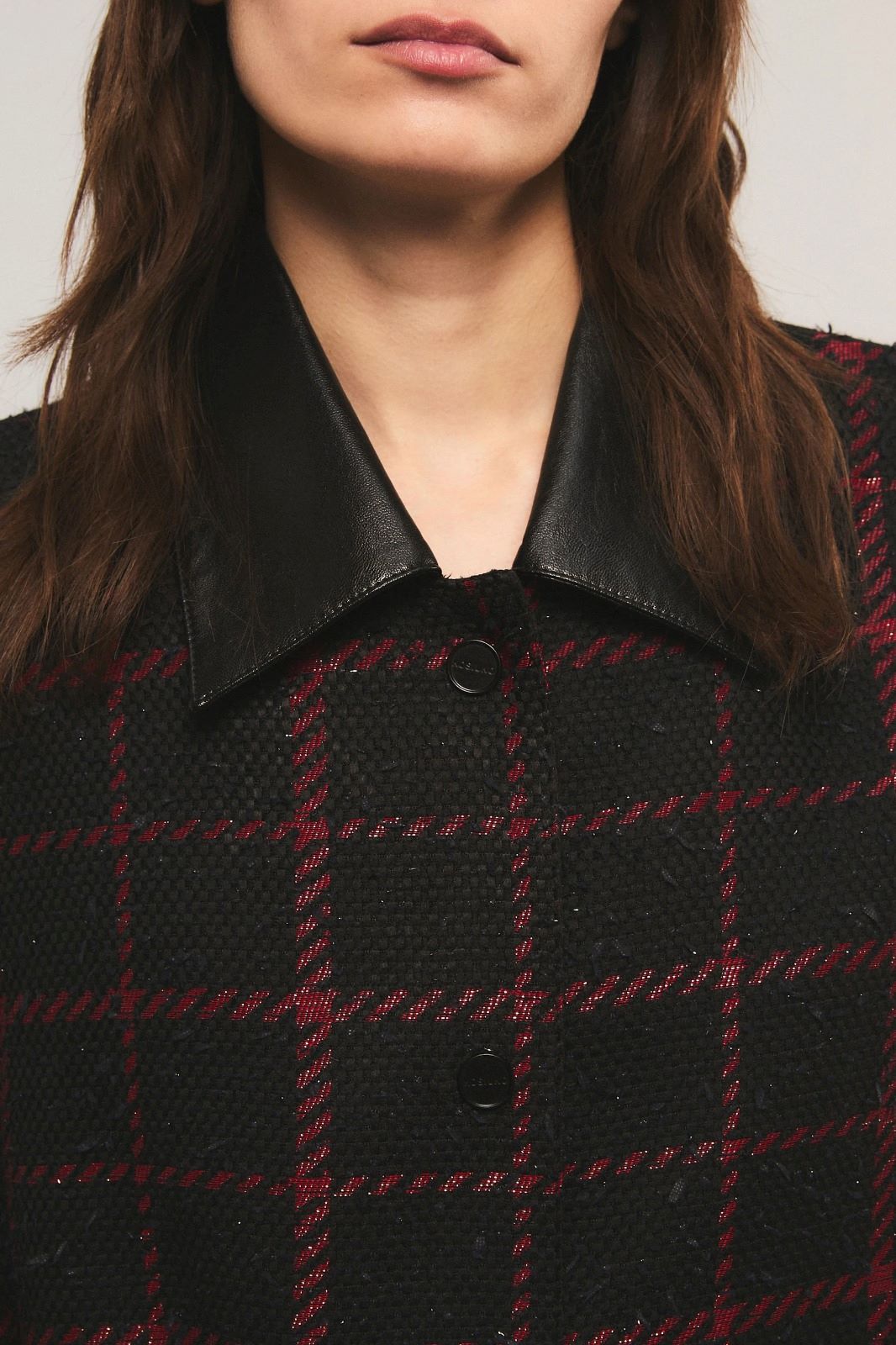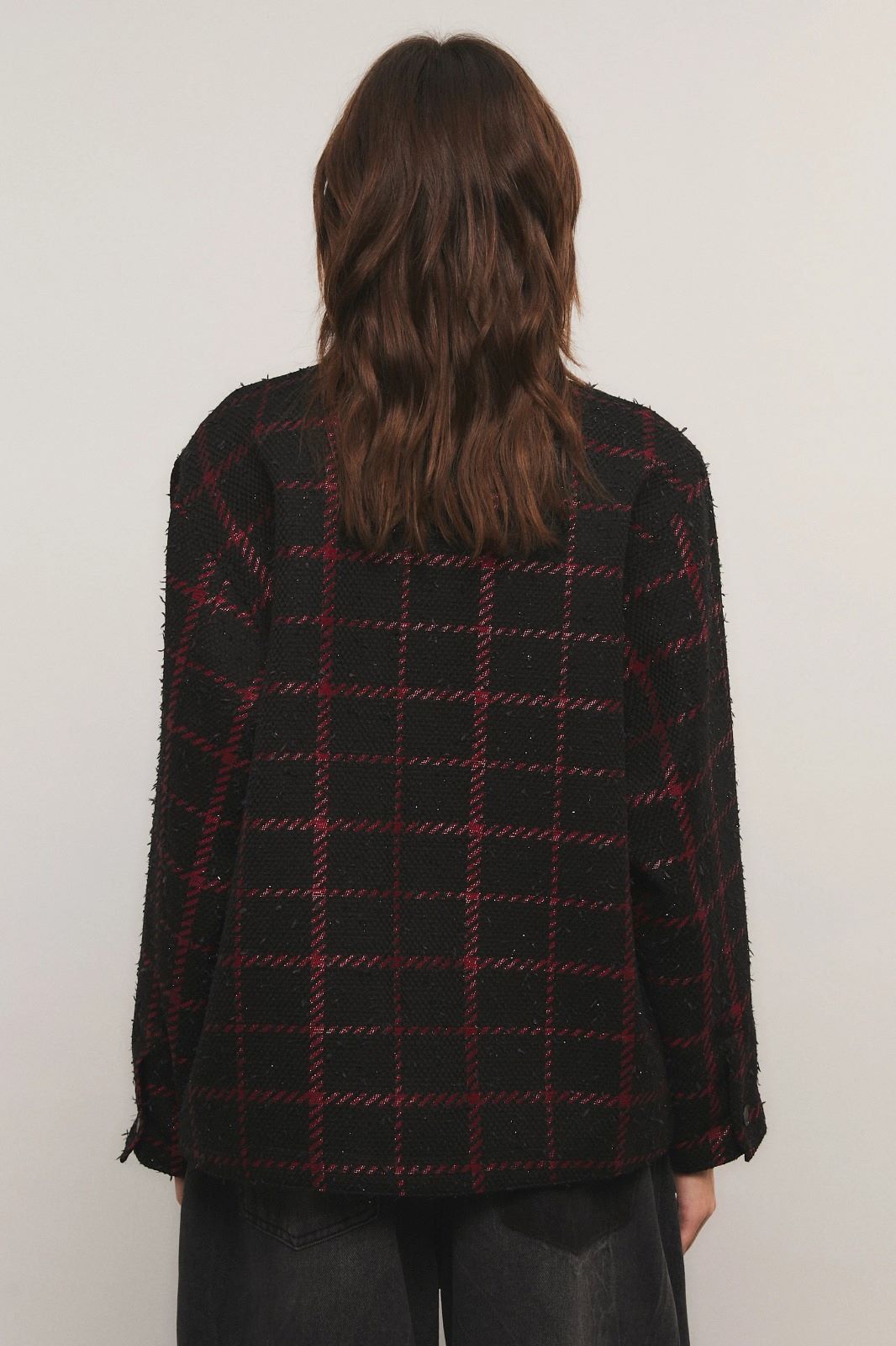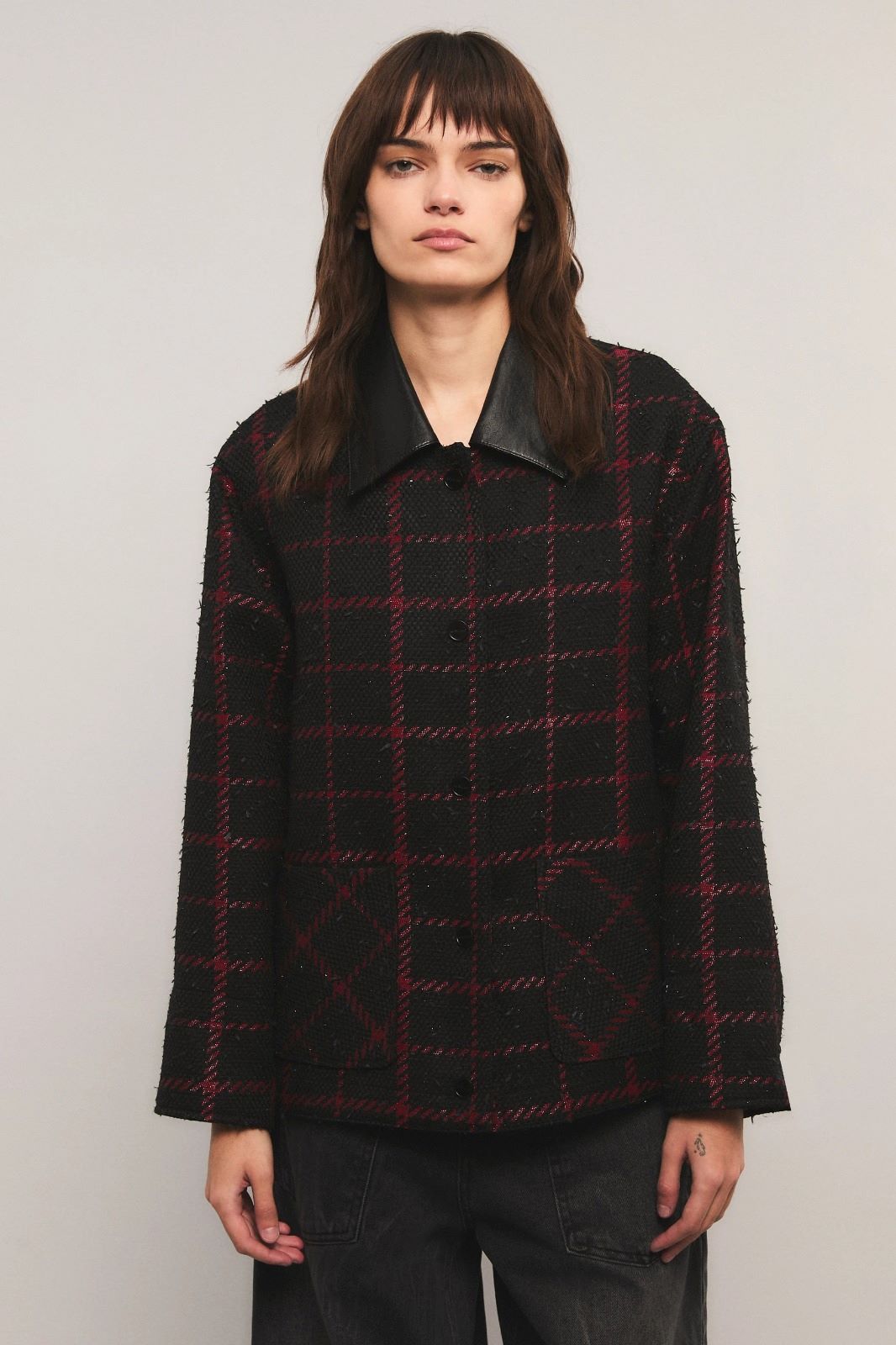 El saco Candem esta confeccionado en un paño diferenciado estilo escocés con textura. Calce oversize. Cuenta con bolsillo plaque en el delantero y su acceso es mediante broches personalizados de la marca. El cuello esta confeccionado en un PU simil cuero. La prenda esta totalmente forrada y en los puños tiene los mismos broches. Miranda está usando en la prenda superior un talle S, y en la prenda inferior un talle S/26. Sus medidas son: Altura 1.73 m. Busto 77 cm. Cintura 59cm. Cadera 85cm.